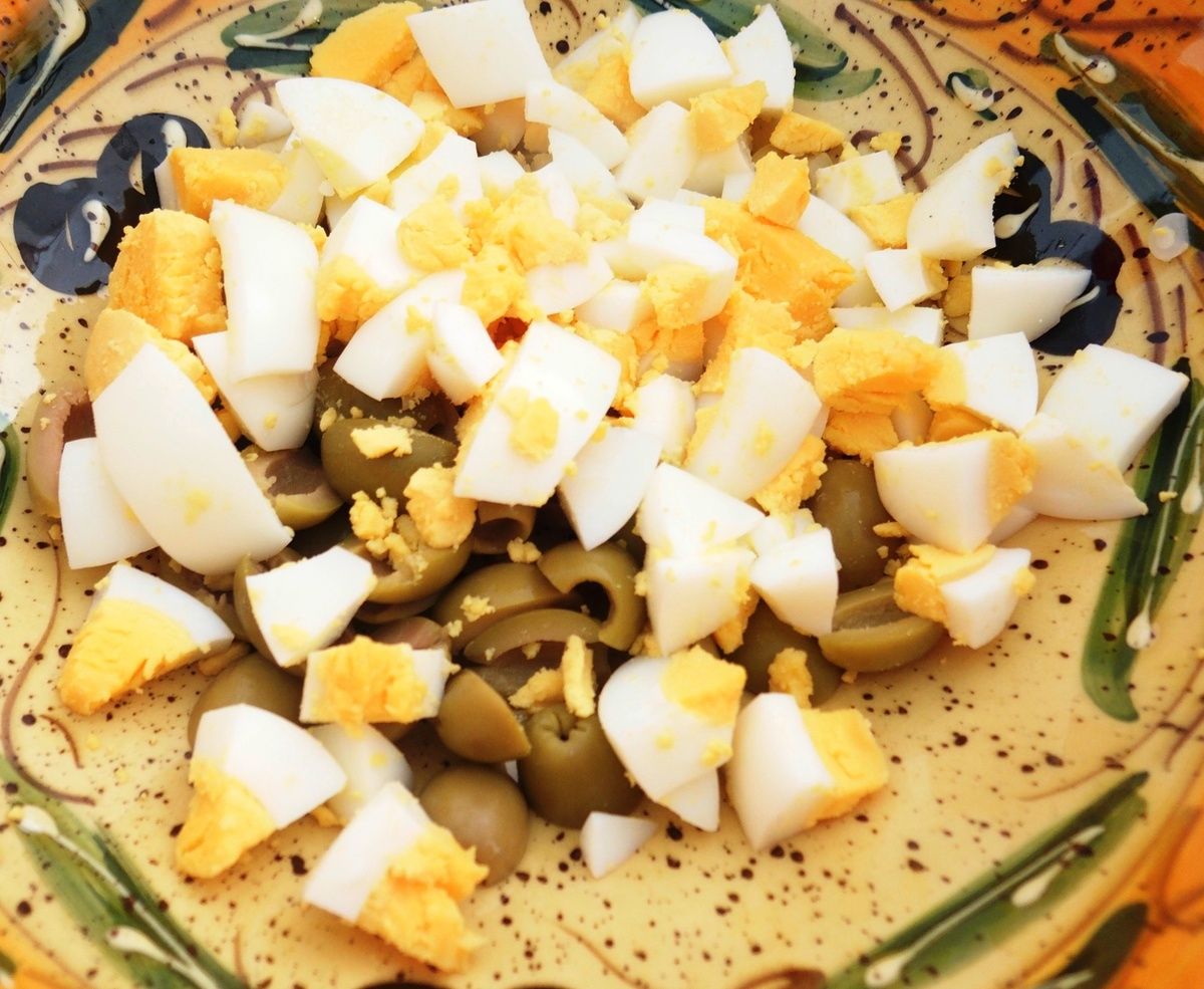 6) Couper les olives en deux et les mettre avec les oeufs en dés dans le plat. Hacher coriandre et menthe et réserver dans un bol.