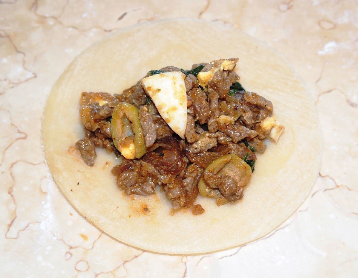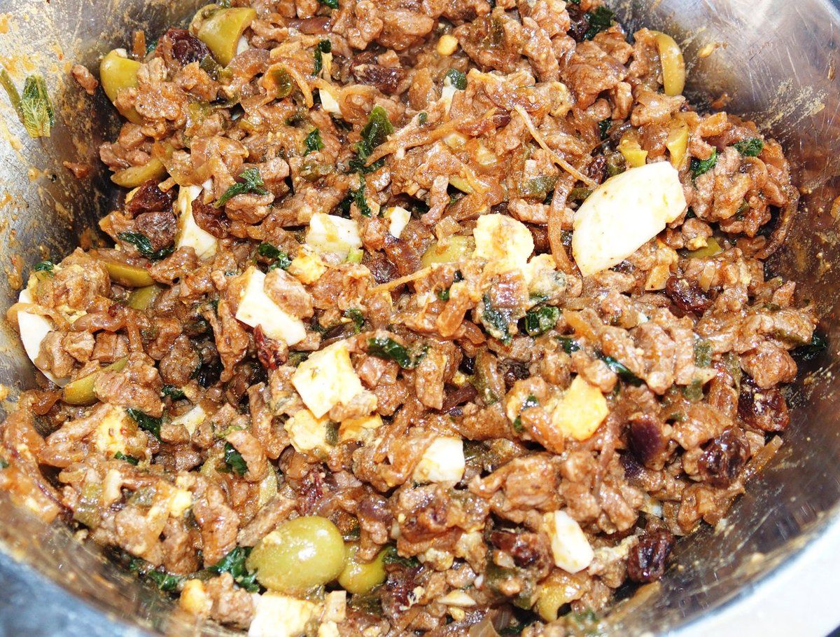 7) Dans une poêle, faire revenir les oignons et l'ail dans un filet d'huile d'olive sur feu moyen-vif. Ajouter la viande et faire revenir 2 minutes. Saler, poivrer. Ajouter une bonne pincée de cumin et de paprika (plus ou moins selon vos goûts). Diluer le concentré de tomate dans 1 dl d'eau et ajouter. Faire complètement réduire. Ajouter la menthe et la coriandre. Laisser tiédir dans un récipient puis mélanger avec les oeufs, les olives et les raisins égouttés. Votre farce est prête!
