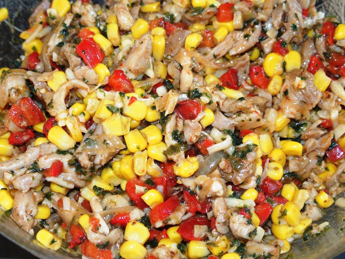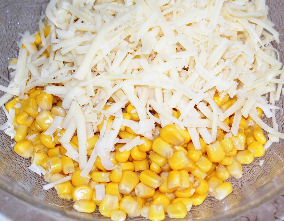 4) Râper le cheddar. Egoutter le maïs et mettre avec le cheddar. Lorsque le poulet est tiède, mélanger le tout. La farce est prête!