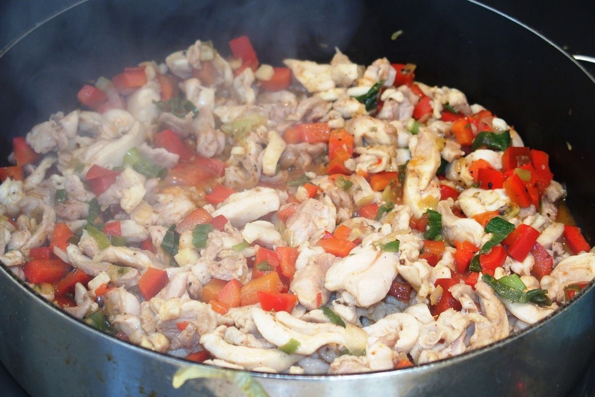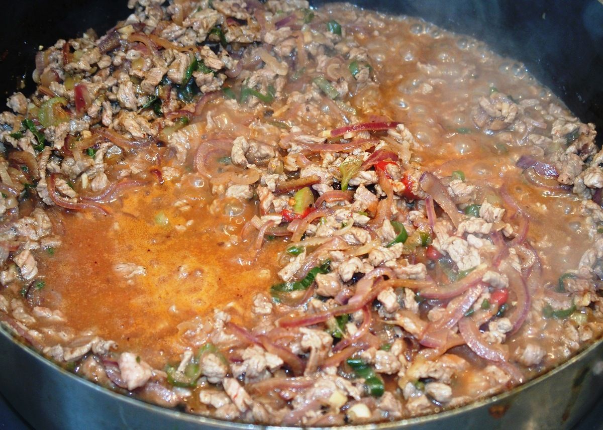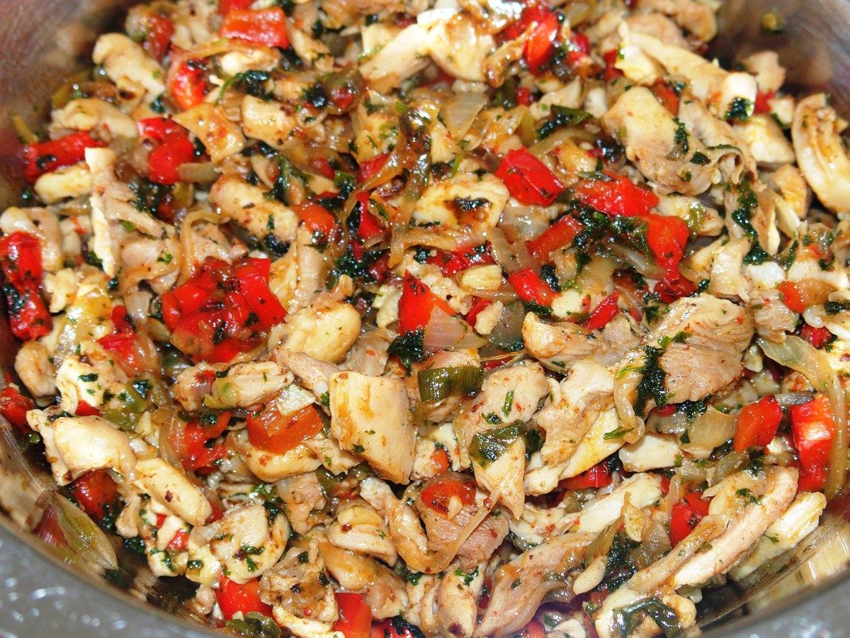 3) Dans une poêle, faire revenir le mélange de légumes dans un filet d'huile d'olive sur feu moyen vif 5 minutes. Ajouter les lanières de poulet. Ajouter une bonne pincée d'origan ainsi qu'une bonne pincée de poudre de chili ou de paprika fort (plus ou moins selon vos goûts). Saler et poivrer. Laisser cuire 10 minutes à feu moyen. Pendant ce temps, hacher le persil. Après 10 minutes, ajouter 1 dl d'eau et faire réduire complètement. Ajouter le persil. Goûter, rectifier l'assaisonnement et laisser tiédir hors du feu dans un récipient.