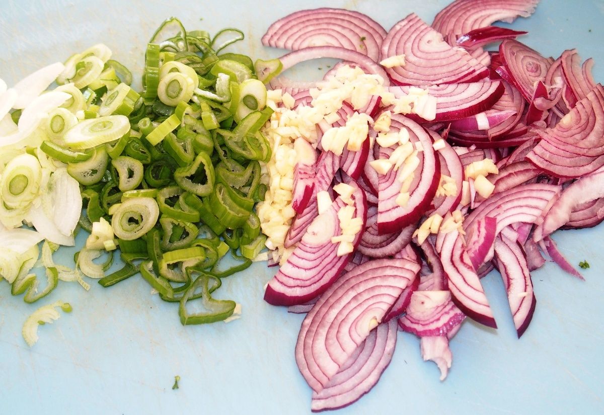 5) Farce au boeuf: 30 minutes avant, réhydrater les raisins secs dans un bol d'eau tiède. Cuire les oeufs 10 minutes dans de l'eau frémissante pour obtenir des oeufs durs. Ecaler et les couper en dés. Réserver. Ciseler les oignons rouges ainsi que l'oignon de printemps avec le 3/4 des tiges et les gousses d'ail. Réserver.
