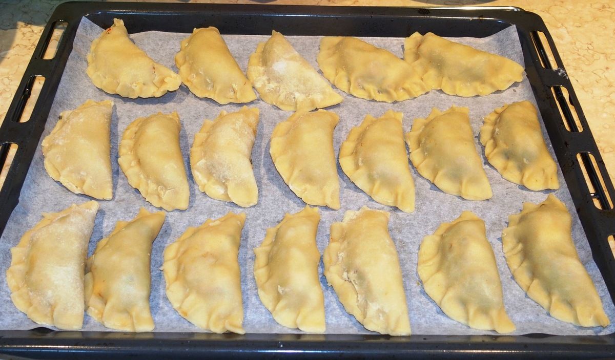 10) Répéter l'opération jusqu'à épuisement des ingrédients. Disposer les empanadas sur une plaque recouverte de papier sulfurisé et les badigeonner à l'oeuf à l'aide d'un pinceau.