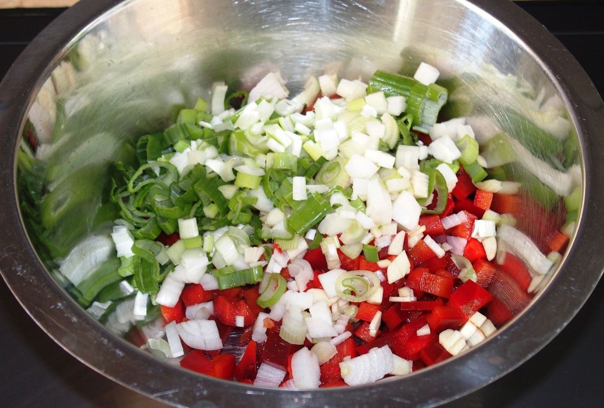 2) Farce au poulet: désosser les cuisses en enlevant la peau puis couper en fines lanières. Réserver dans un récipient. Laver le poivron, le couper en deux dans la longueur puis ôter le centre. Le tailler en petits dés. Emincer l'oignon jaune. Ciseler l'oignon de printemps avec le 3/4 des tiges. Hacher les gousses d'ail. Mettre le tout dans un autre récipient.