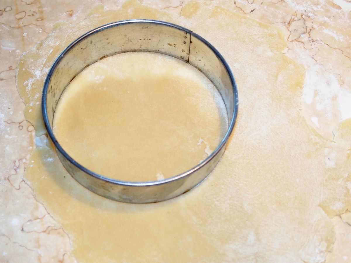 8) Préchauffer le four à 200°C. Etaler la pâte maison (la sortir du réfrigérateur 10 minutes avant) à l'aide d'un rouleau à pâtisserie sur un plan de travail fariné. Ou disposer devant vous une première abaisse de pâte. Prendre un emporte-pièce d'un diamètre d'environ 10cm. Découper des ronds de pâte. Ne pas hésiter à étaler les chutes de pâte! Prendre un pinceau et le tremper dans de l'eau froide. Humidifier ainsi tout le pourtour du rond puis placer une càs de farce au centre.