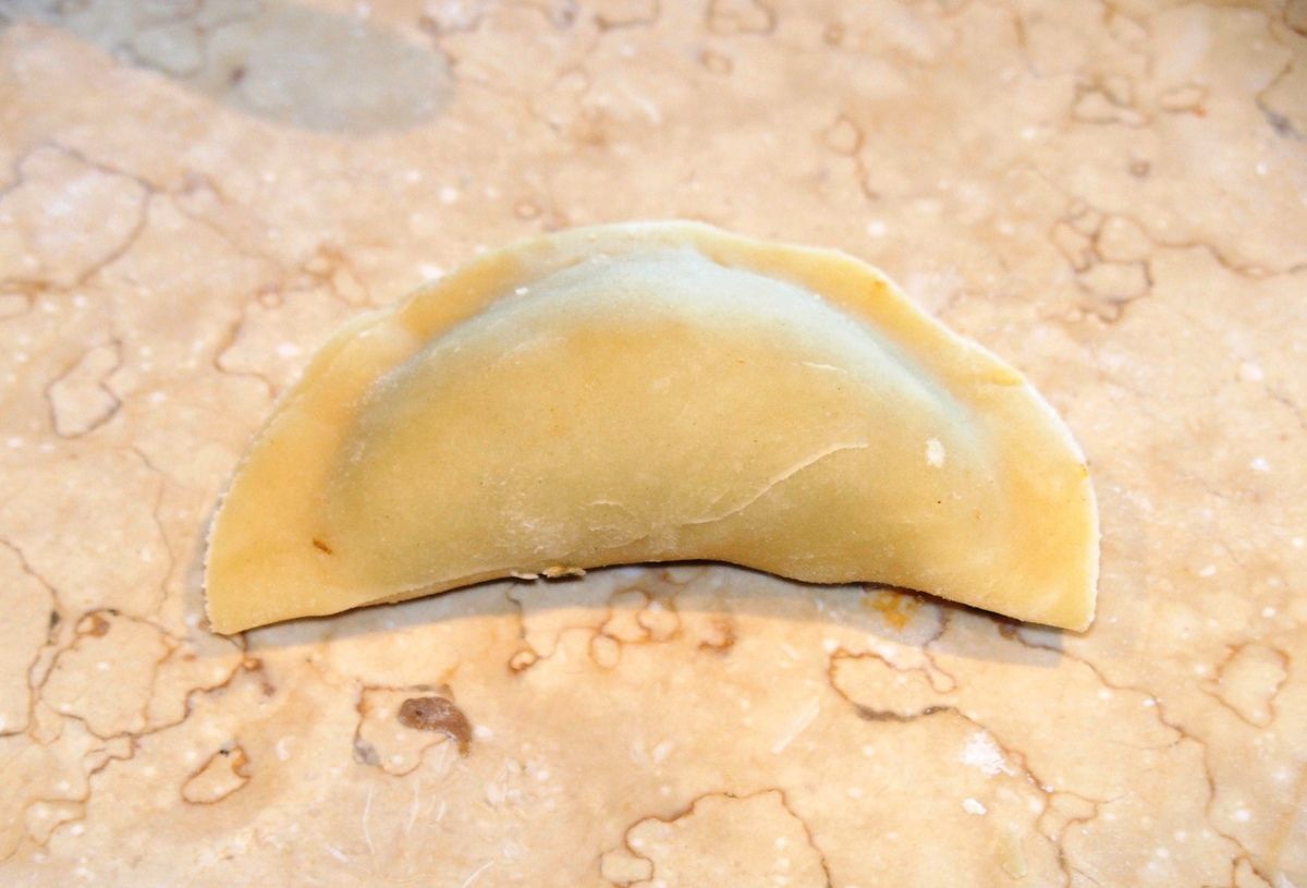 9) Rabattre la moitié du rond sur la deuxième. Avec les doigts, bien retravailler tout le bord pour sceller les deux pâtes. Puis pincer la pâte régulièrement pour donner une petite décoration.
