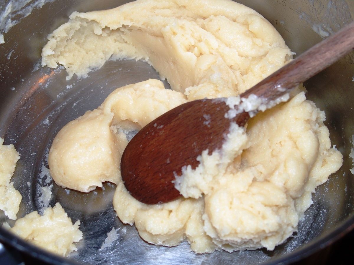 3) Hors du feu, verser la farine d'un coup. Mélanger vivement avec une spatule jusqu'à ce que la pâte soit lisse. Remettre la casserole sur le feu et sur feu doux, mélanger encore la pâte durant 1 à 2 minutes pour la sécher. Cette étape est très importante pour que les pommes dauphines gonflent bien à la cuisson. Elle doit être homogène et se décoller toute seule de la casserole en un morceau. Sortir la casserole du feu et mettre la pâte à choux dans un récipient.