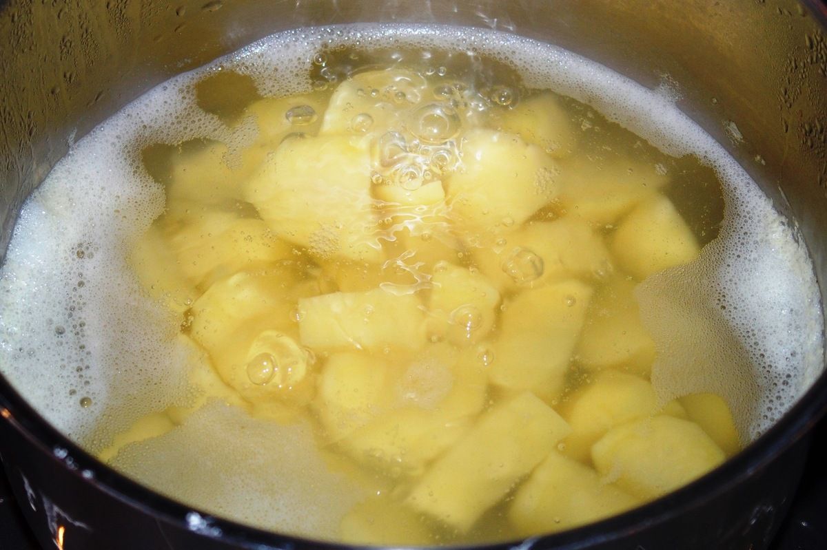5) Ajouter les pommes-de-terre écrasées et mélanger. Poivrer, saler.