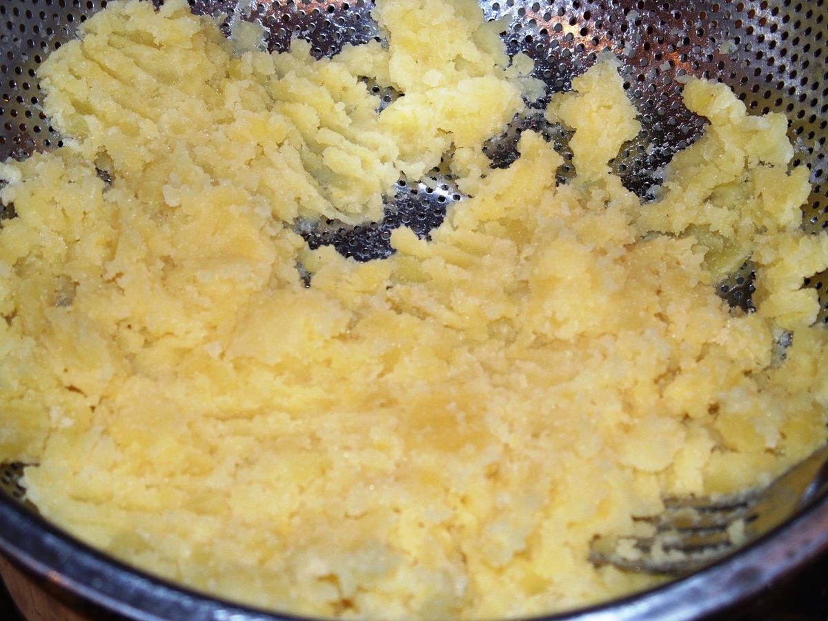 1) Peler les pommes-de-terre et les passer sous l'eau froide. Les couper en morceaux. Les mettre dans une casserole d'eau froide avec une càc de sel, une bonne pincée de muscade et deux tours de moulin à poivre. Porter à ébullition puis baisser le feu sur feu moyen et laisser cuire 20 minutes, le temps que les pommes-de-terre soient bien cuites. Egoutter et laisser tiédir. Ecraser les pommes-de-terre soigneusement avec une fourchette.