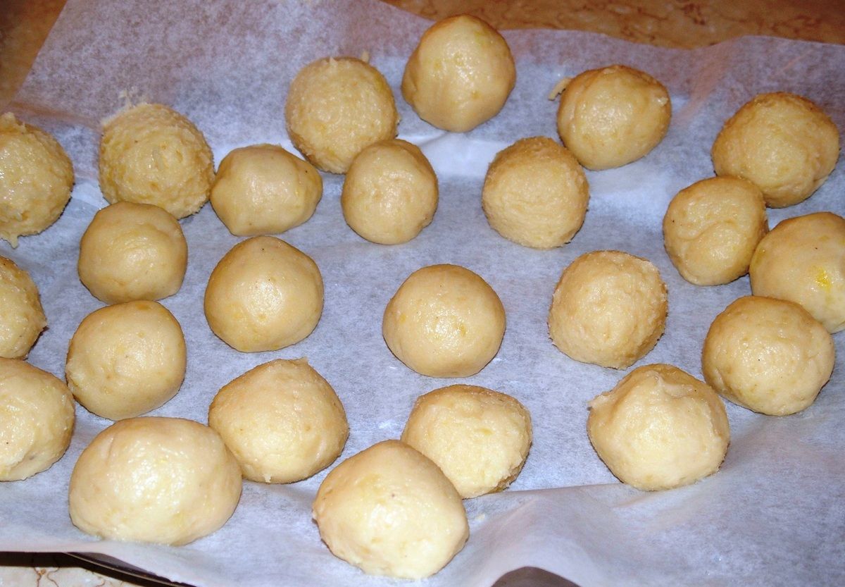 6) Mettre de la farine dans une assiette à soupe. Devant vous, placer un plat recouvert de papier sulfurisé. Avec les mains farinées, rouler des boules de la taille d'une noix avec la pâte entre les deux paumes. Disposer dans le plat. Réfrigérer jusqu'à la cuisson si vous ne les faites pas frire tout de suite.