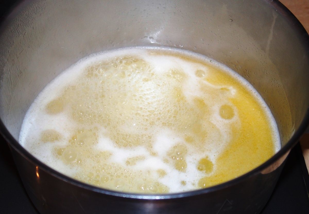 2) Pendant que les pommes-de-terre cuisent, délayer les oeufs dans un récipient avec une fourchette. Dans une casserole, mettre l'eau, 1/2 càc de sel ainsi que le beurre. Porter à ébullition.