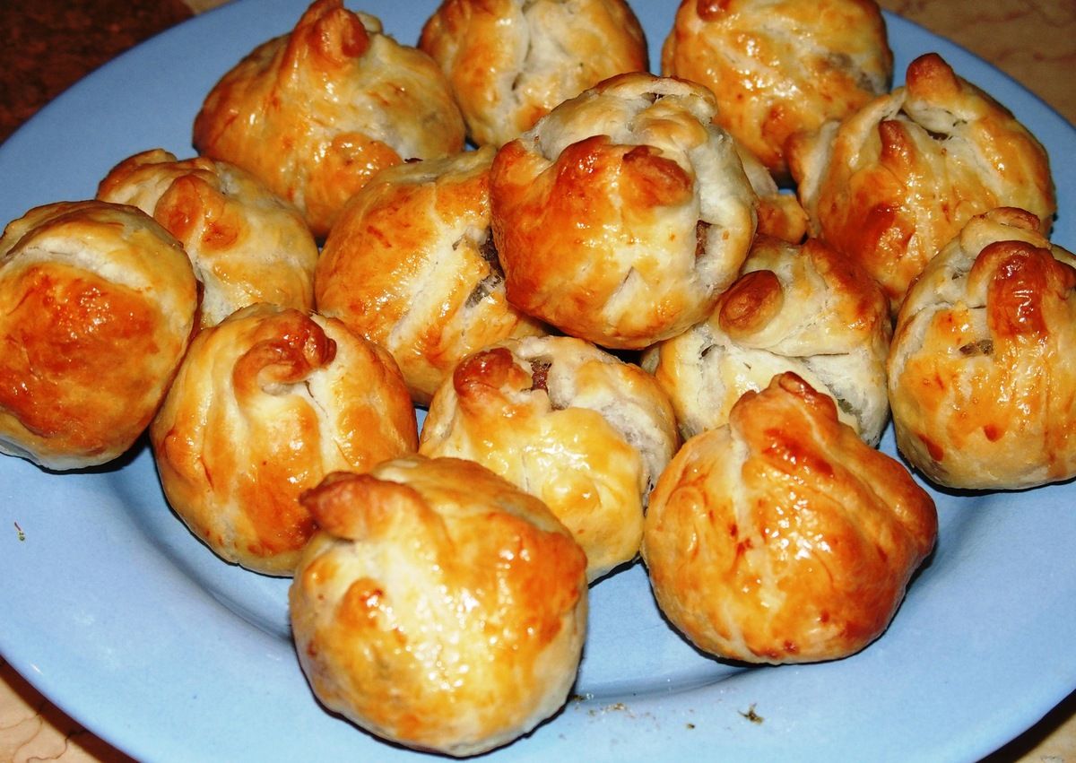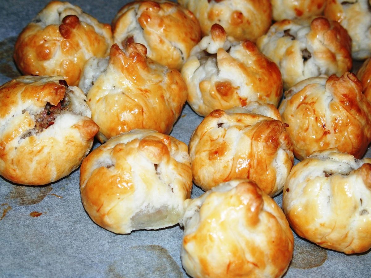 4) Préchauffer le four à 200°C. Disposer l'abaisse de pâte sur le plan de travail et découper des carrés dans cette pâte d'environ 8cm de côté, à l'aide d'un emporte-pièce. Déposer une boule de viande au centre de chaque carré. Rabattre la pâte au centre pour réunir les côtés du carré et souder avec les doigts puis tourner la pâte en spirale pour donner une forme de bonbon sur le dessus. Mélanger le jaune d'oeuf avec un peu de lait et dorer chaque feuilleté de toutes parts. Enfourner au milieu du four préchauffé à 200°C pour 20 à 25 minutes, jusqu'à ce que les feuilletés soient dorés. Servir chauds, tièdes ou froids!