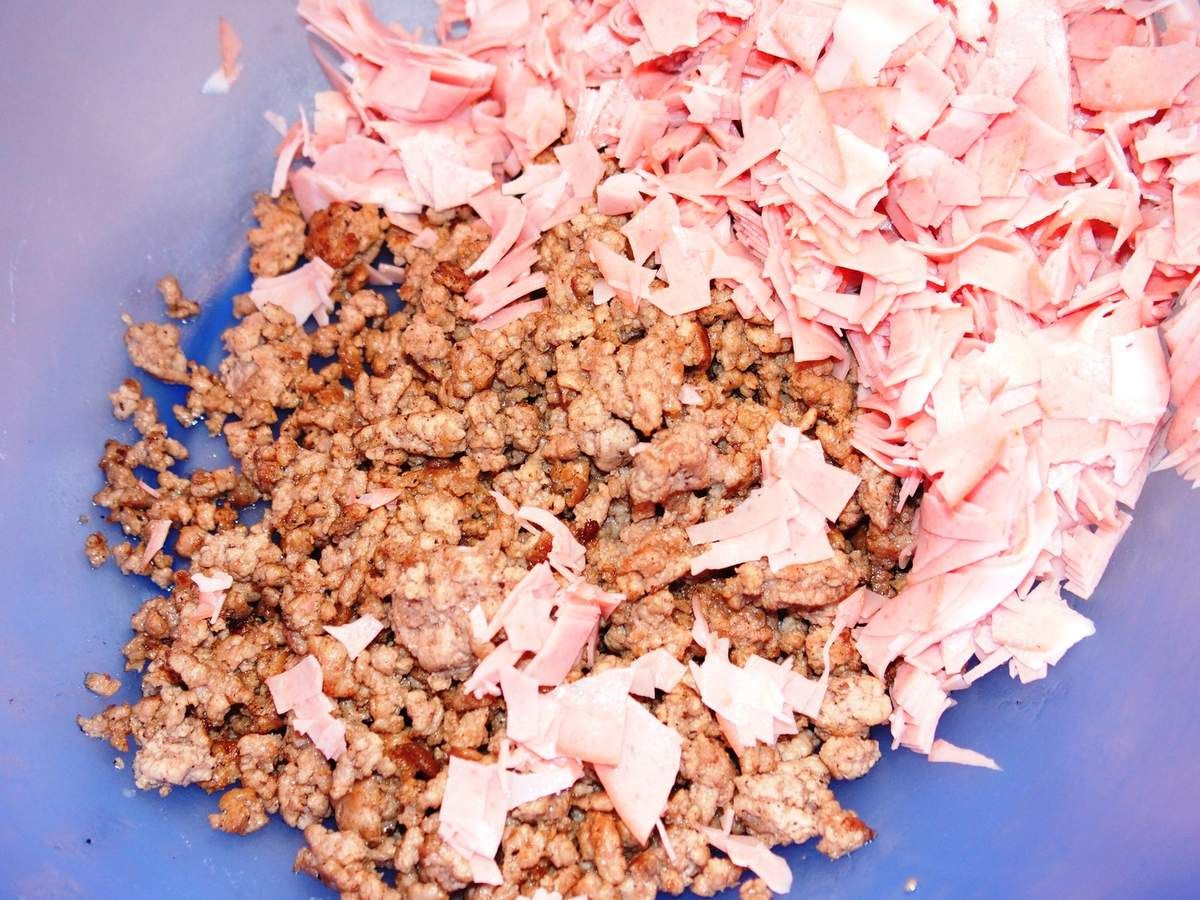 2) Hacher finement la mortadelle et mettre avec la viande. Hacher le persil et ajouter. Ajouter le parmesan ainsi que les 2 oeufs préalablement battus. Essorer le pain de mie entre les doigts et ajouter, ainsi que la chapelure. Bien mélanger le tout. Saler et poivrer.