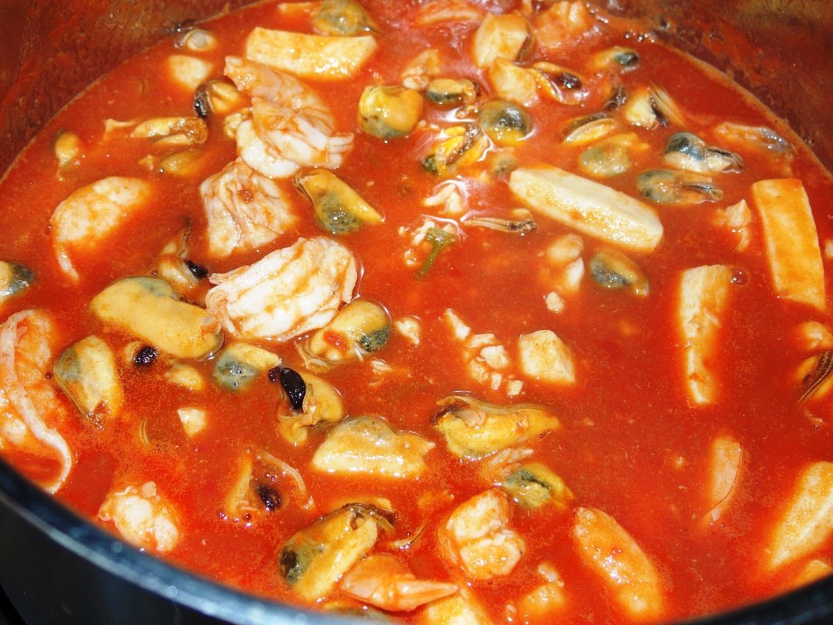 4) Mettre le jus des moules dans la casserole du fond de poisson après 1 heure de cuisson. Passer le tout à travers un chinois ou une passoire fine. Remettre 6 dl dans la casserole. Ajouter le coulis de tomate et porter à ébullition. Baisser le feu et laisser mijoter 10 minutes. Ajouter tout d'abord les anneaux de calamars (coupés en morceaux ou non). Après 5 minutes, ajouter les vongoles, les crevettes et les morceaux de poisson. 5 minutes plus tard, lorsque les vongoles sont ouvertes, les crevettes roses et les morceaux de poisson cuits, ajouter les moules décortiquées et cuire encore 1 minute. Goûter et rectifier l'assaisonnement. Mélanger immédiatement la sauce avec des pâtes al dente et parsemer d'un peu de persil. Servir.