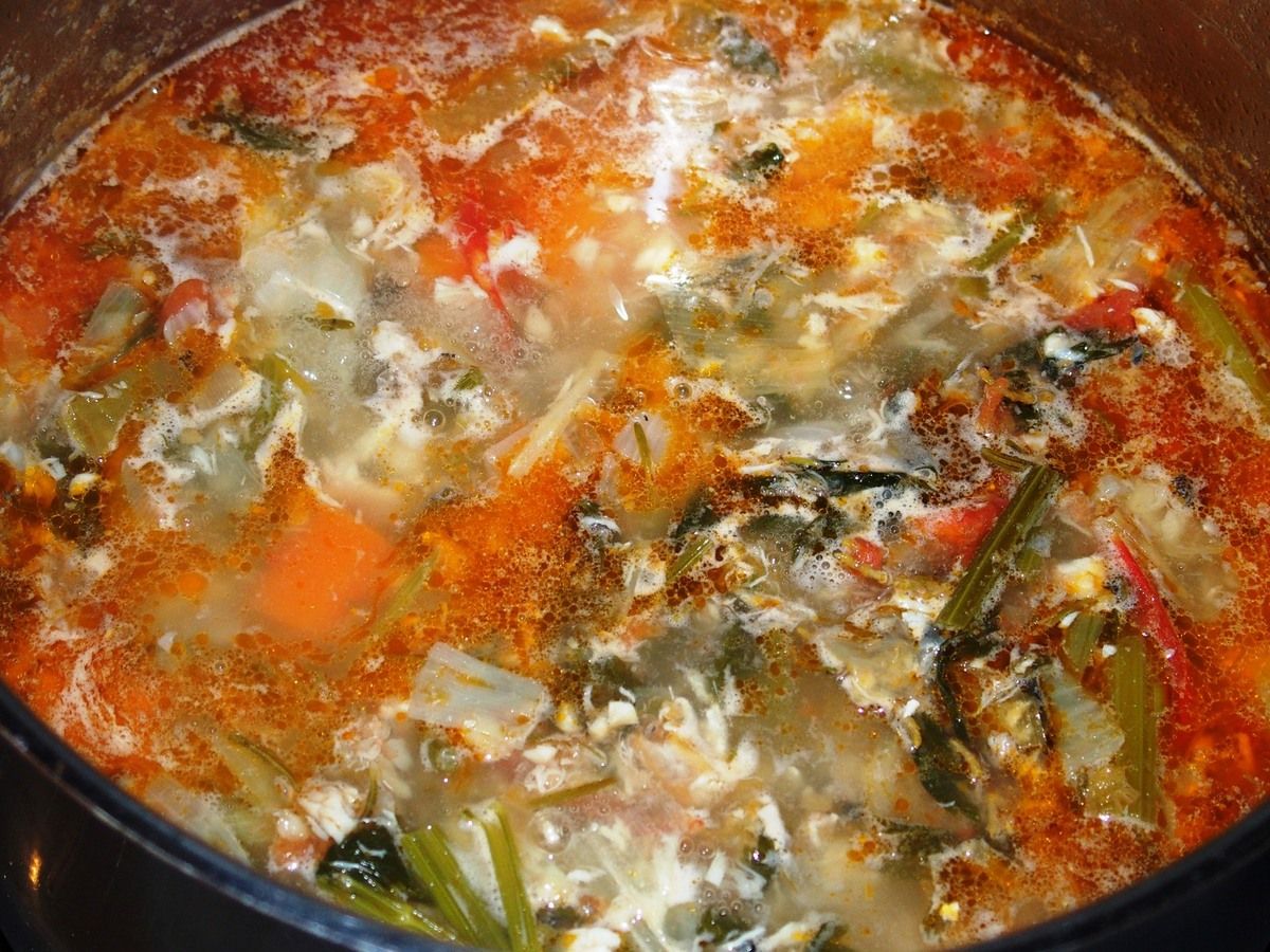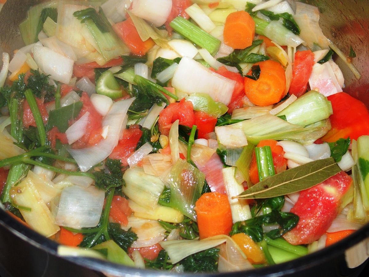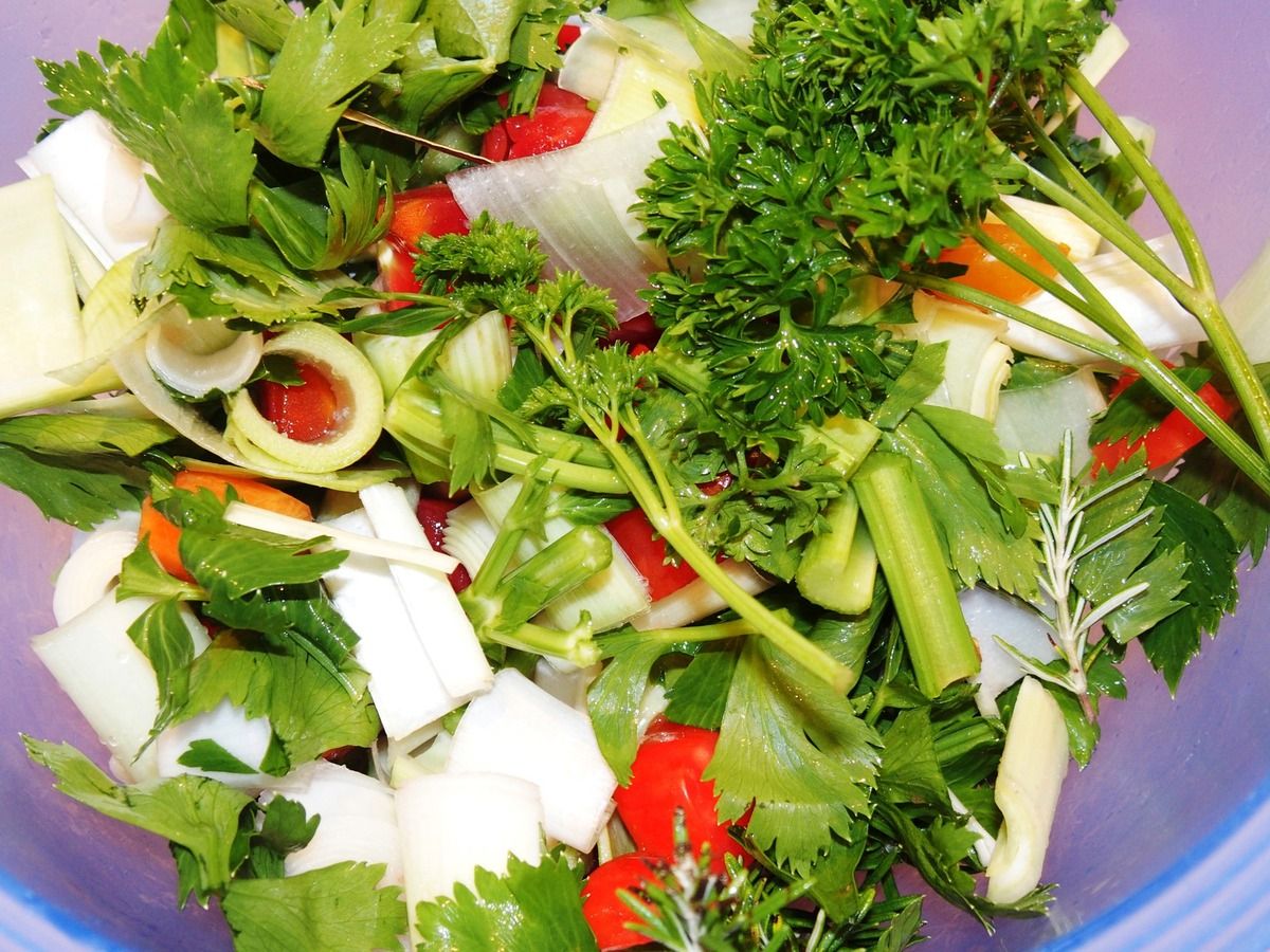 1) Préparer le fond de poissons: laver (peler si nécessaire) et couper les légumes en gros morceaux. Soit le poireau (uniquement le blanc), les carottes, les branches de céleri avec les feuilles, les gousses d'ail, l'oignon et les tomates. Mettre dans un récipient avec le persil, le romarin et les feuilles de laurier.