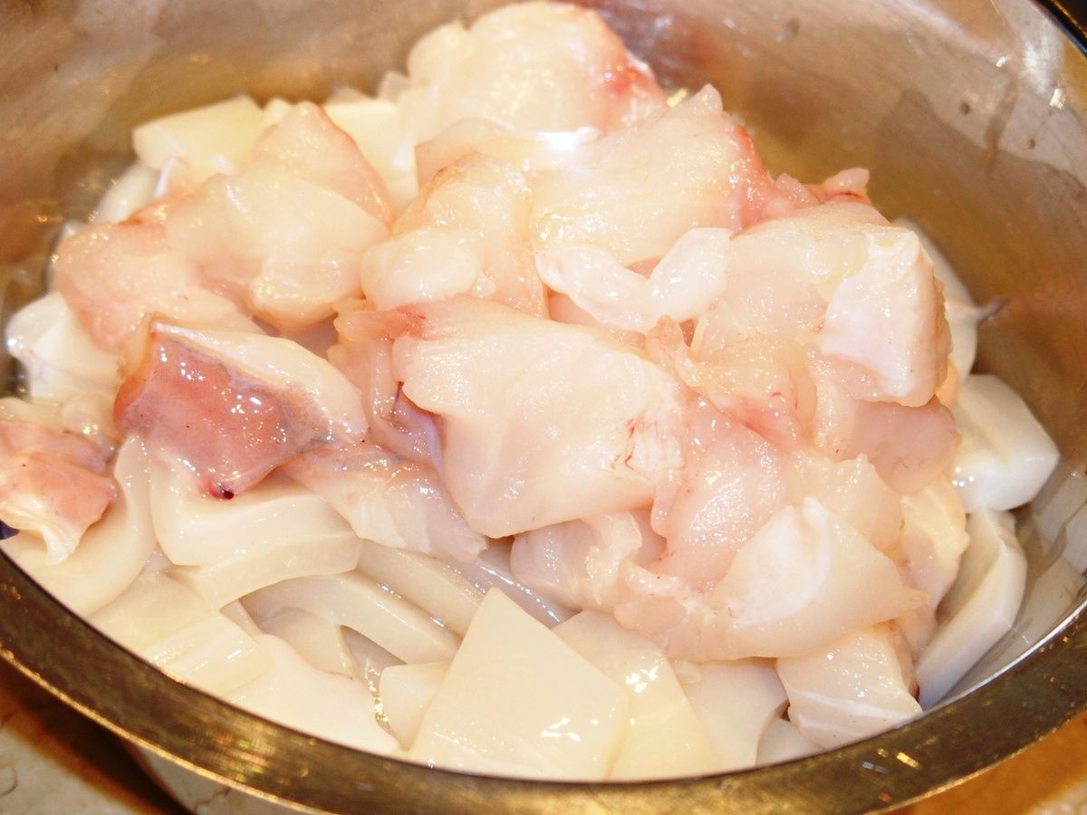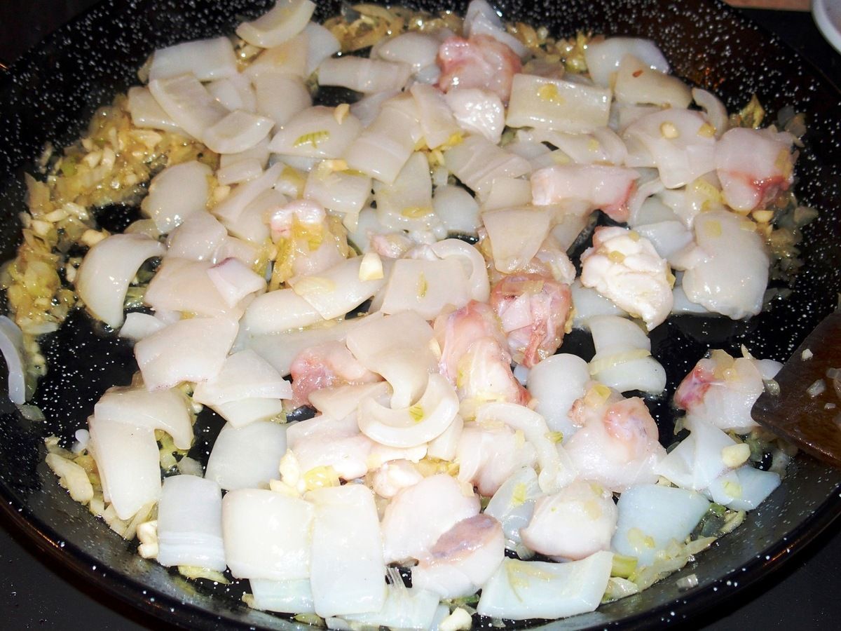 4) Préparation des ingrédients pour la fideuà: Hacher oignon et ail. Ouvrir les calamars en deux et les couper en carrés. Couper les filets de baudroie en cubes.