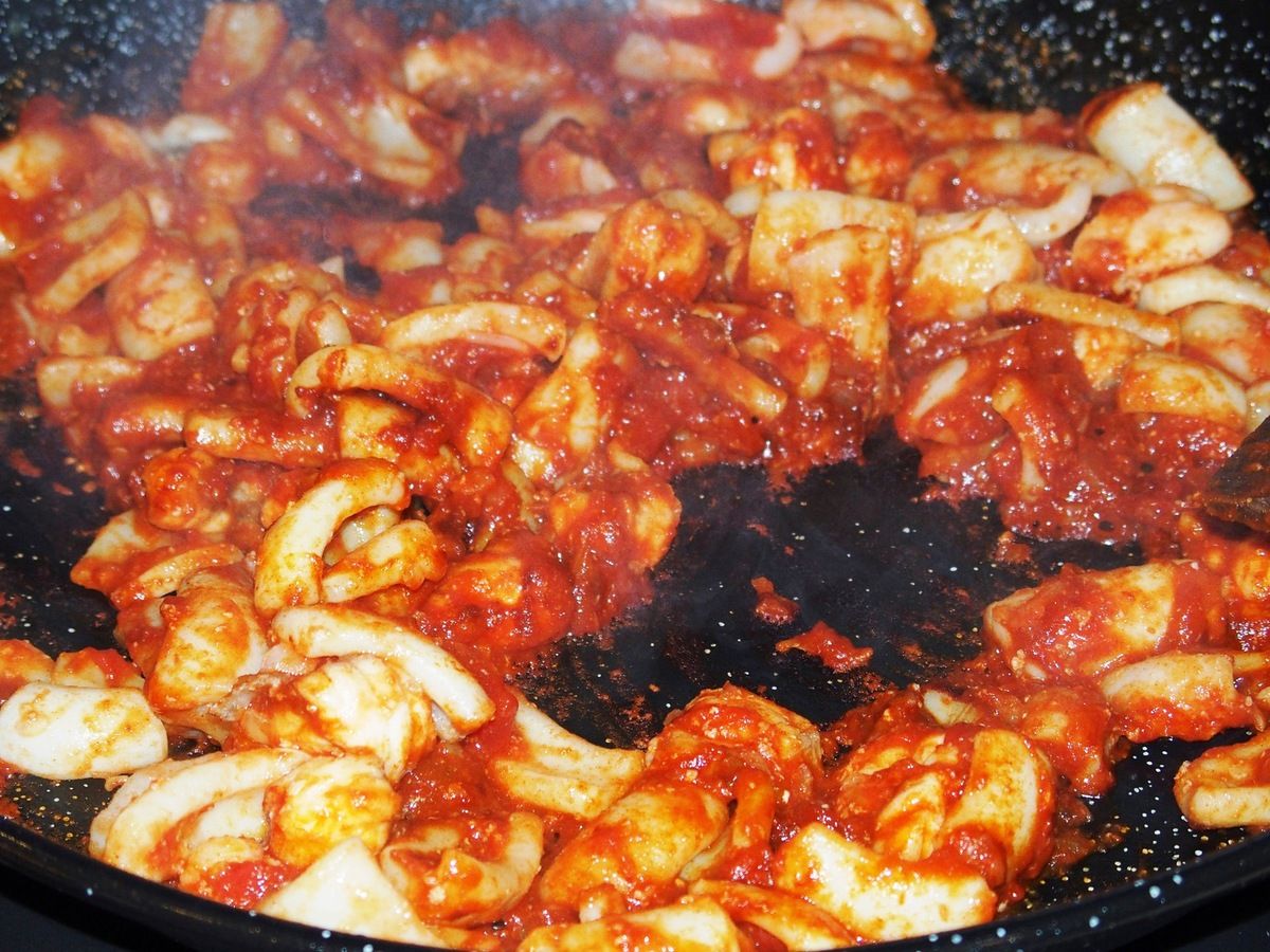 5) Cuisson de la fideuà: Dans une grande poêle, mettre à chauffer un bon filet d'huile d'olive. Saisir les gambas (et langoustines s'il y en a) sur feu vif en les retournant durant 2 minutes. Les mettre de côté sur une assiette. Ajouter oignon et ail dans la poêle (remettre un peu d'huile d'olive si besoin). Mélanger, sur feu moyen-vif. Ajouter les calamars et la baudroie. Saler. Mélanger durant environ 5 minutes. Ajouter la purée de tomates et le pimenton. Bien mélanger et faire revenir encore 2 minutes.