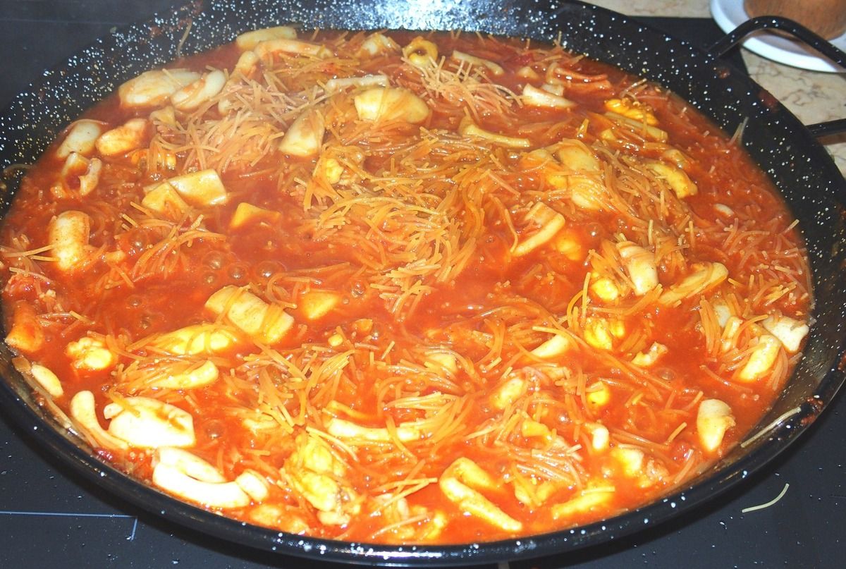 Je vous entends déjà. "Qezako?" "Hein?". Bah ben c'est une fideuà quoi. De la balle, une recette à se relever la nuit. Espagnole. De Valence plus précisément. En gros c'est une sorte de paella réalisée avec des vermicelles, donc des pâtes au lieu du riz. On adoooore à la maison.