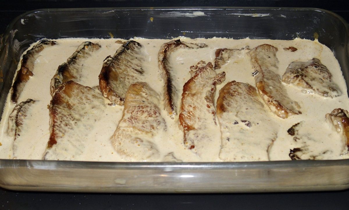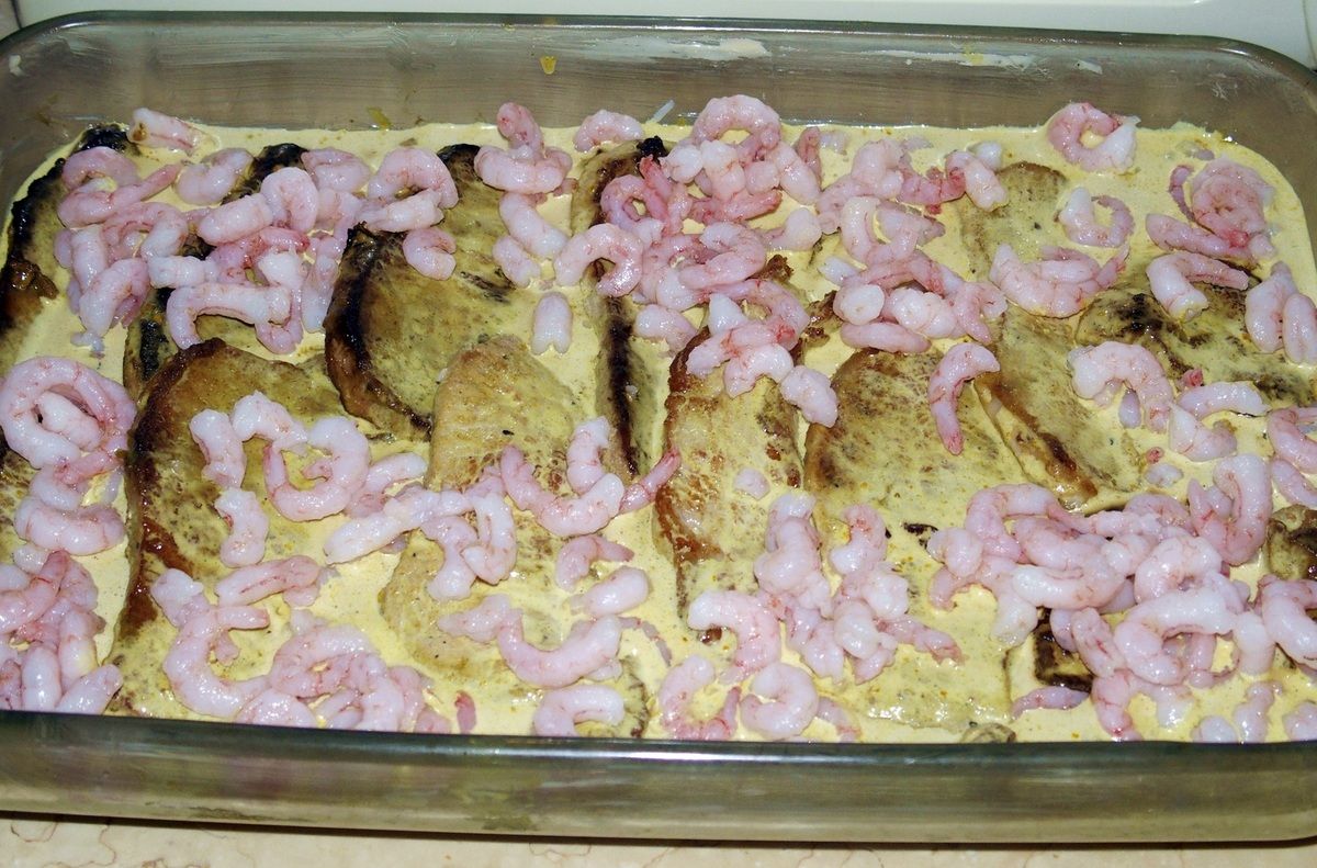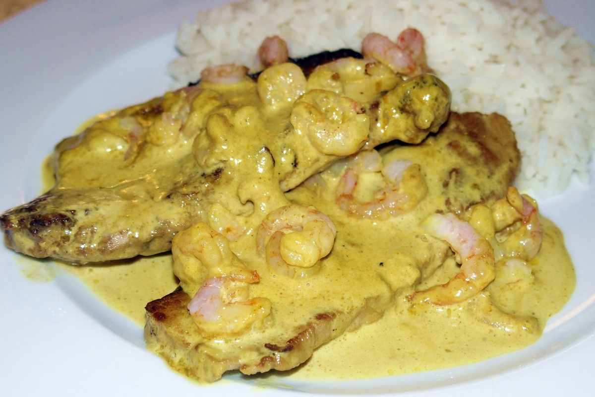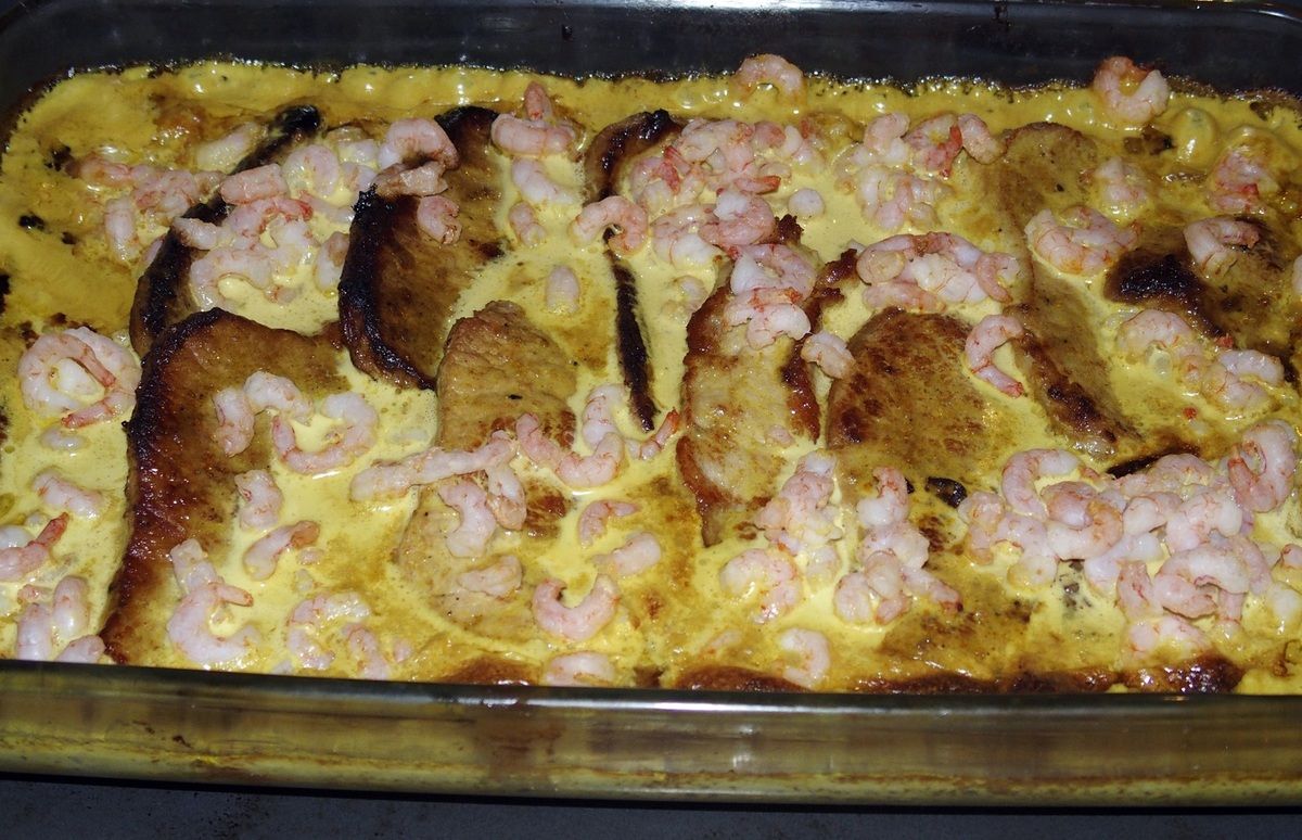 3) Préparer la sauce: dans le récipient contenant le jus de la viande (point 1), ajouter la crème entière, la fécule, le cognac, 1 càc de curry doux, 1/2 càc de sel, du poivre, le curcuma. Mélanger avec le fouet. Verser cette sauce sur la viande. Répartir les crevettes par-dessus.