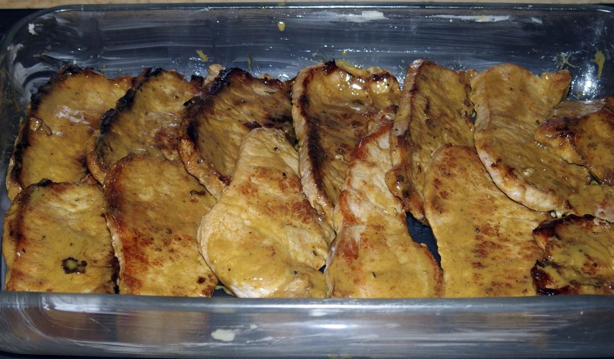 2) Préparer la marinade pour la viande: mélanger 2 càs de moutarde, 1 càc de curry de Madras, quelques tours de moulin à poivre, 1 càc de jus de citron, 2 càs de sauce Worcestershire. Badigeonner chaque morceau de viande de toutes parts à l'aide d'un pinceau à pâtisserie. Disposer les tranches dans un plat à gratin beurré en les faisant se chevaucher. Préchauffer le four à 220°C.