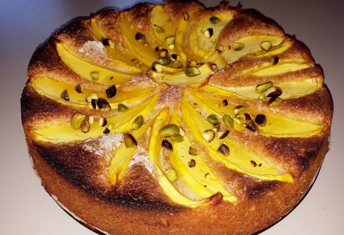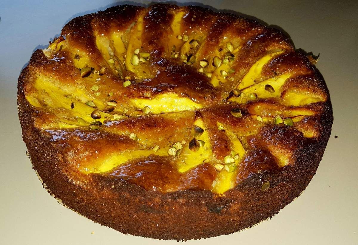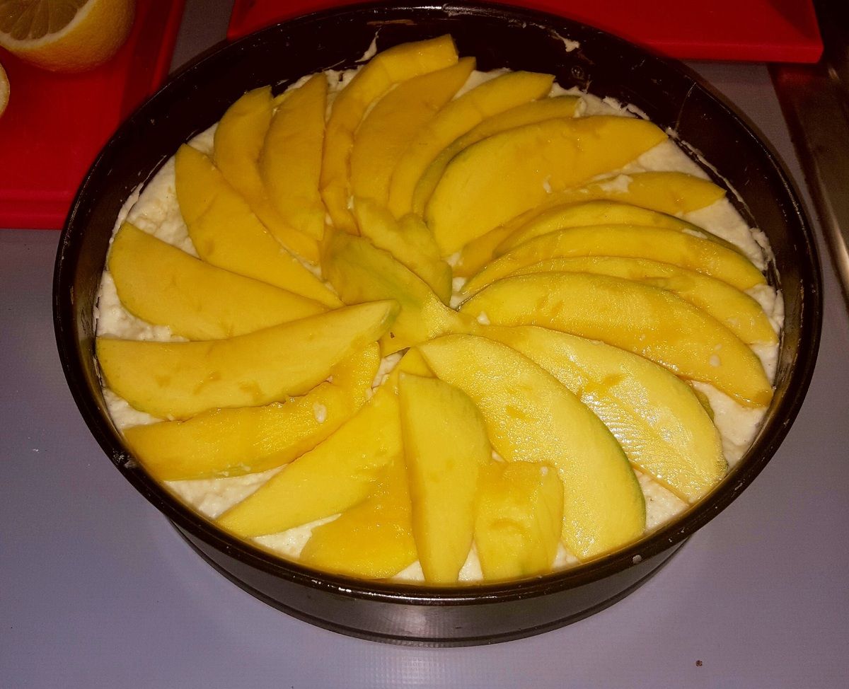 3) Peler la mangue, la couper autour du noyau et découper des tranches. Déposer les tranches sur le dessus du gâteau en les faisant se chevaucher. Enfourner au milieu du four pour 1 heure. Après 1 heure, saupoudrer le gâteau avec le sucre brun et enfourner encore 10 minutes. Sortir le gâteau et le laisser refroidir un peu, puis le démouler sur un plat (sans oublier de l'arroser avec un peu de sirop (voir point 6).