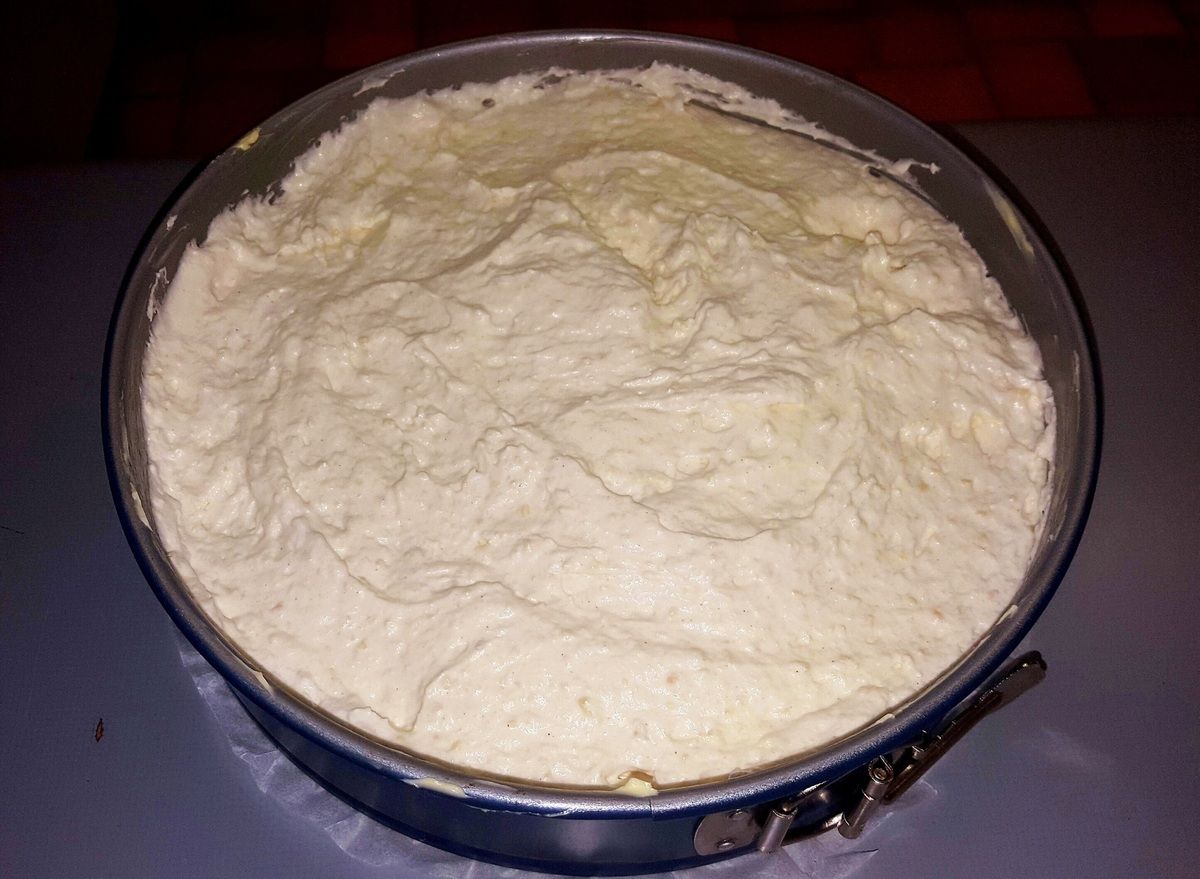 2) Mettre 1 pincée de sel et 1 càc de jus de citron avec les blancs d’œufs dans un récipient (réserver 7 jaunes pour la crème anglaise) . Monter les blancs d’œufs en neige à l’aide d’un batteur électrique. Ajouter le sucre glace petit à petit. Ajouter ensuite successivement la farine, les amandes, la cardamome et la noix de coco. Ajouter enfin le beurre fondu. Mettre ce mélange dans le moule.