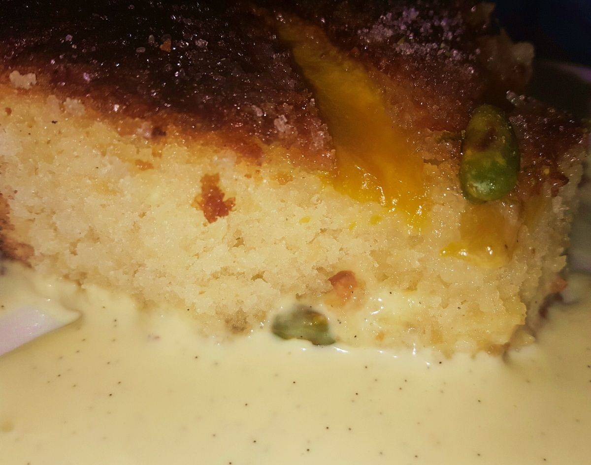 8) Pour le service, parsemer le gâteau de pistaches torréfiées. Déposer une tranche de gâteau dans l’assiette, verser un peu de sirop par-dessus et déposer une petite louche de crème anglaise à côté de la tranche. Déguster.
