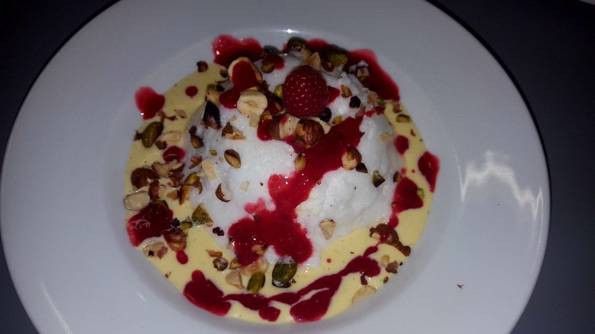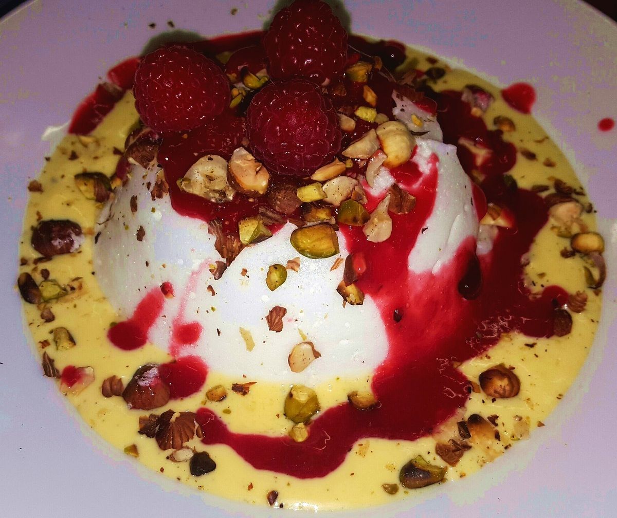 6) Pour le service : mettre un fond de crème anglaise dans une assiette. Déposer l’île au milieu. Saupoudrer de noisettes et pistaches concassées. Décorer avec un filet de coulis de framboises ou de fruits rouges. Déguster avec délectation!