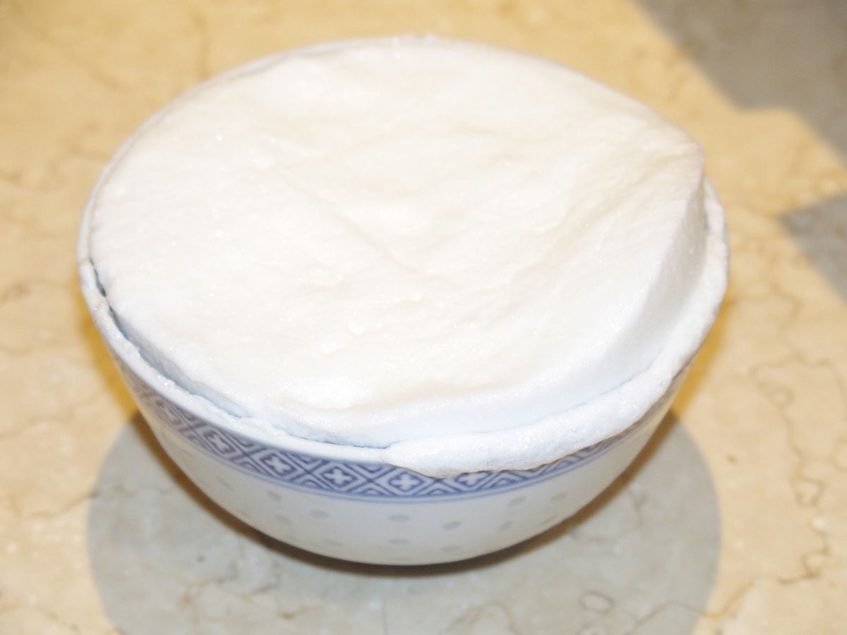 3) Préparer les îles flottantes : dans un récipient, mettre les blancs d’œufs avec une petite pincée de sel, le tiers du sucre et le jus de citron. Monter les blancs en neige doucement d’abord puis de plus en plus vite. Ajouter le reste du sucre progressivement. Lorsque les blancs laissent un « bec d’oiseau » sur le fouet, ils sont prêts ! Huiler légèrement les bols avec du papier ménage. Remplir les bols à ras en tassant bien. Il ne faut pas qu'il y ait de "trous d'air" dans le bol.