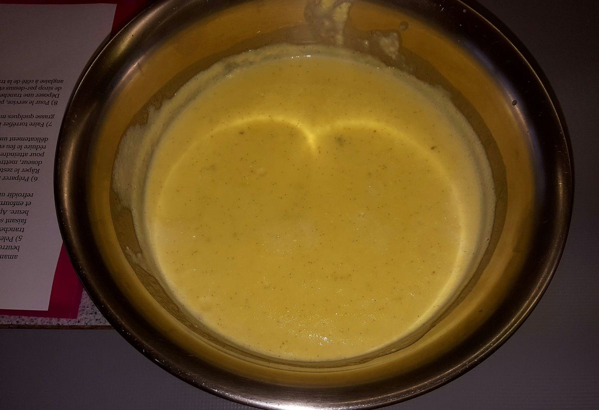 1) Préparer la crème anglaise : dans un récipient, mettre les jaunes d’œufs (réserver les blancs pour l’île flottante). Ajouter le sucre. Ajouter les graines de la gousse de vanille et fouetter le tout brièvement.