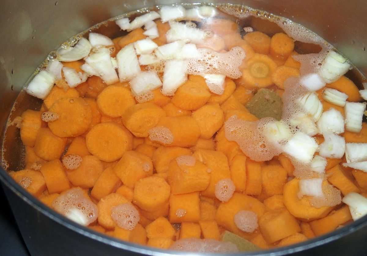 1) Eplucher les carottes et les couper en rondelles. Hacher grossièrement l’oignon. Mettre le tout dans une casserole avec 1 litre d’eau et les cubes de bouillon. Porter à ébullition et laisser cuire sur feu moyen environ 20 minutes (les carottes doivent être tendres).