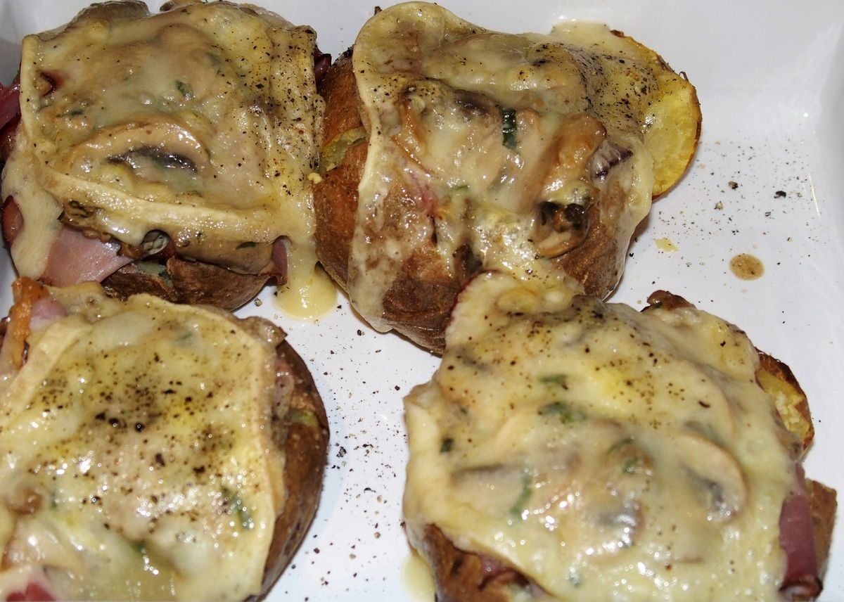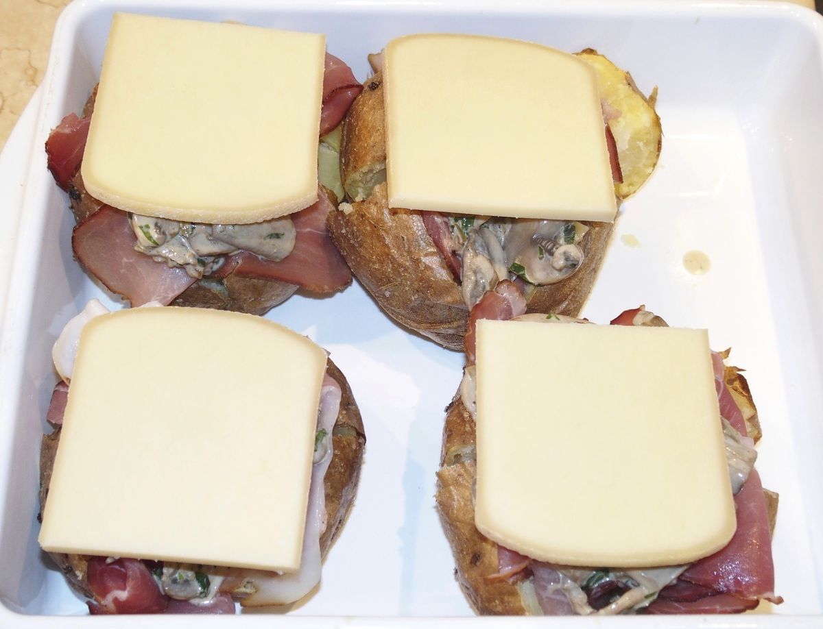 Déposer 2 tranches de jambon cru dans les incisions puis une grosse cuillère de champignons. Déposer par-dessus une tranche de fromage à raclette. Poivrer et placer les pommes de terre dans un plat à gratin. Enfourner sous le gril du four à forte chaleur environ 10 minutes jusqu'à ce que le fromage soit fondu et doré. Servir avec la crème acidulée à la ciboulette à côté des pommes de terre.