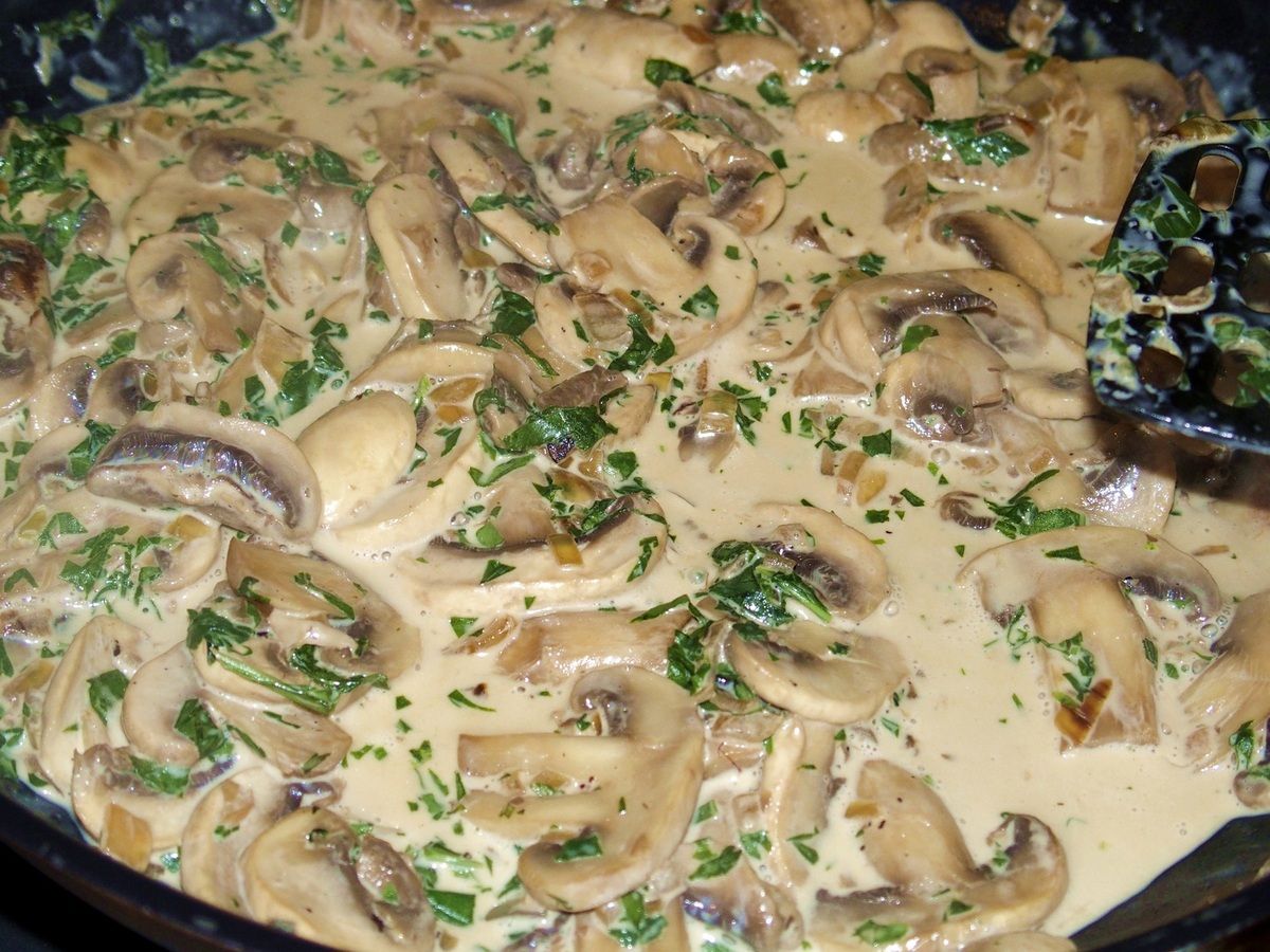 Couper les champignons de Paris en lamelles. Hacher l'oignon. Dans une poêle, mettre un peu d'huile d'olive et faire revenir l'oignon une minute. Ajouter les champignons. Faire revenir jusqu'à évaporation complète de l'eau des champignons. Saler et poivrer. Ciseler le basilic. Ajouter la crème et le basilic dans la poêle et laisser mijoter à feu doux deux minutes. Réserver.