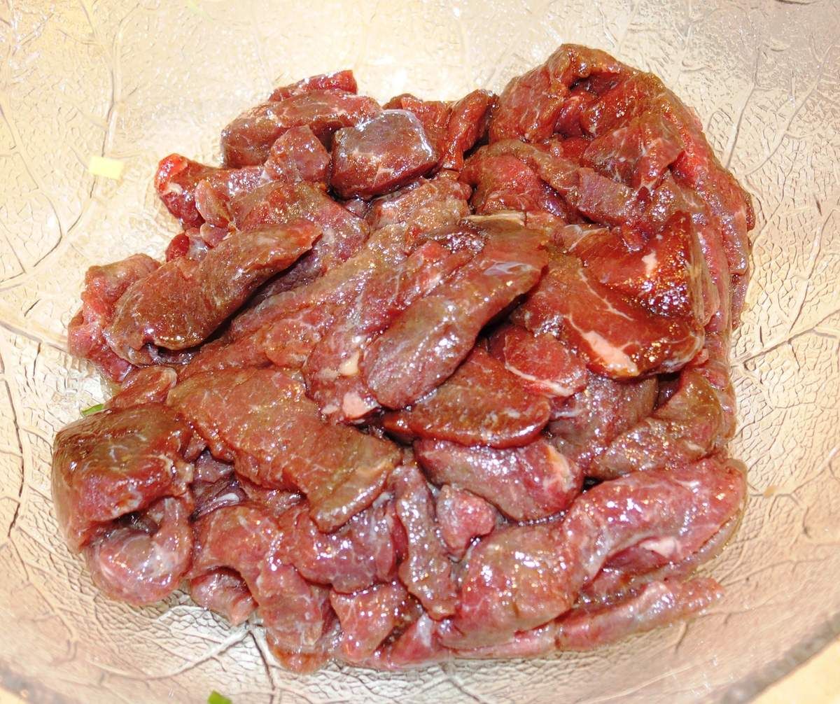 5) Dans un wok ou une poêle haute, faire sauter les morceaux de viande 1 à 2 minutes maximum à feu vif dans un peu d'huile sans qu'ils ne se superposent. Procéder en plusieurs fois si nécessaire. Réserver la viande et son jus dans un récipient. Essuyer la poêle avec du papier ménage.