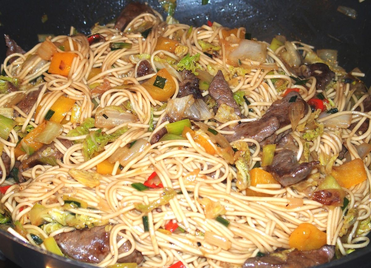 Le lendemain donc, j'ai regardé ces beaux morceaux de viande coupés en grosse allumettes et je me suis dit "Tiens, je vais faire des nouilles chinoises". Comme je suis une fan de la cuisine asiatique, j'en ai toujours dans mon placard (des nouilles donc, pas des asiatiques). Hop un inventaire de mon réfrigérateur et me voilà avec une série de légumes qui ne demandaient qu'à être vite mangés.