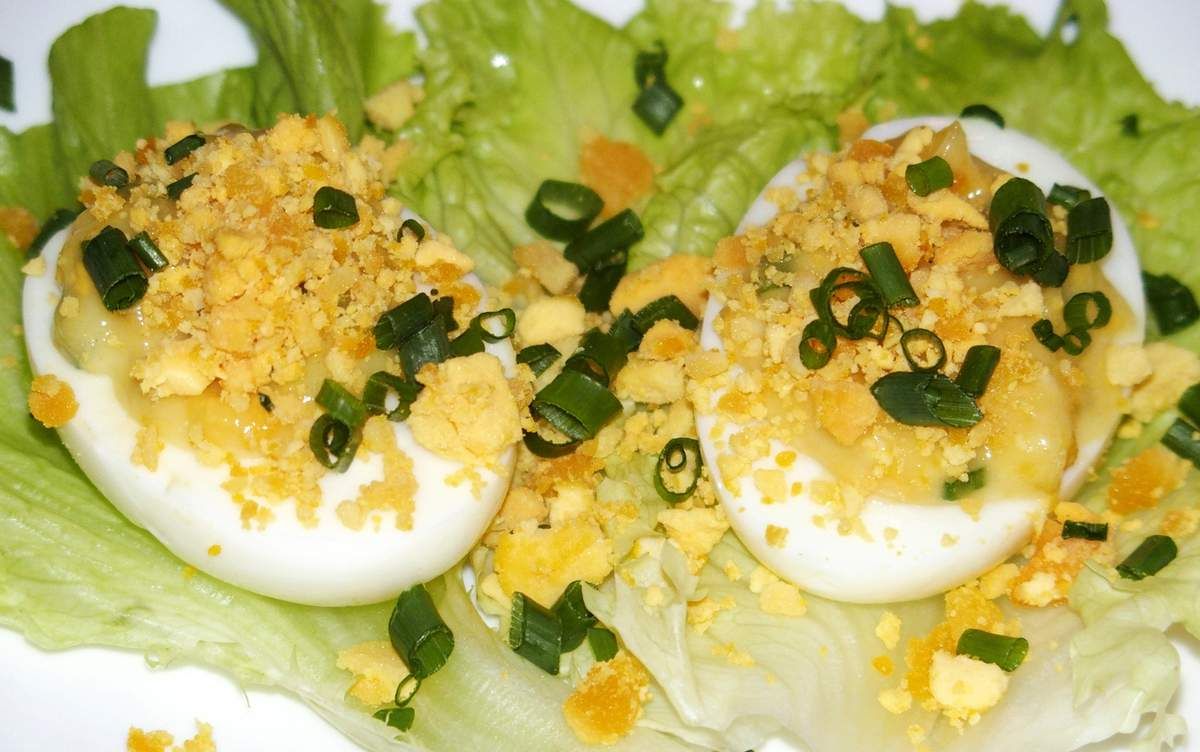 4) Au moment de servir, remplir les moitiés des blancs avec la mayonnaise généreusement puis parsemer de ciboulette et de jaunes d’œufs émiettés. Disposer sur un plat, sur des feuilles de salade par exemple.