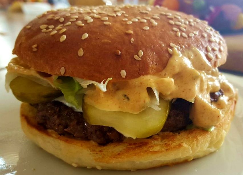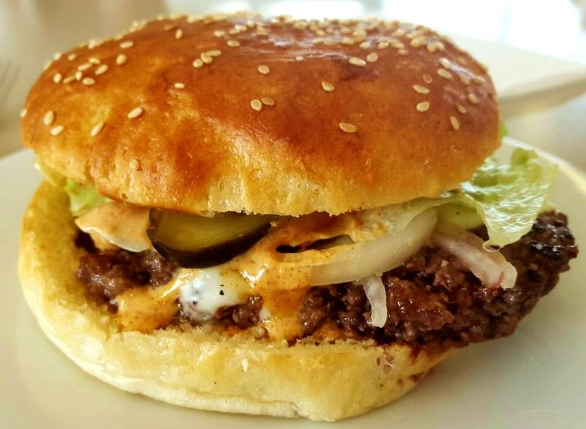 - sur le fond, mettre dans l’ordre de la sauce, un peu d’oignon, un peu de laitue, un steak haché (fromage contre le bas) et une ou deux lamelles de concombres.