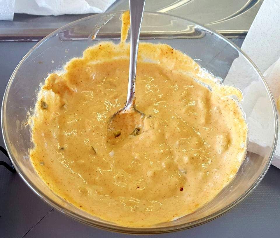 1) Préparer la sauce : hacher finement les lamelles de concombres. de quoi en obtenir 2 càs. Mélanger soigneusement avec tous les autres ingrédients et réserver.