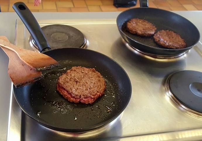 4) Cuire les steaks hachés dans une poêle avec un peu d’huile à rôtir quelques minutes sur chaque face. Saler et poivrer. En tournant les steaks, ajouter sur la moitié d’entre eux une tranche de fromage à fondre et cuire la deuxième face. Réserver dans du papier aluminium le temps de cuire les pains.
