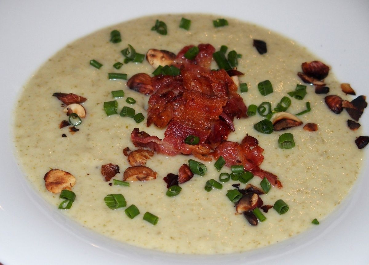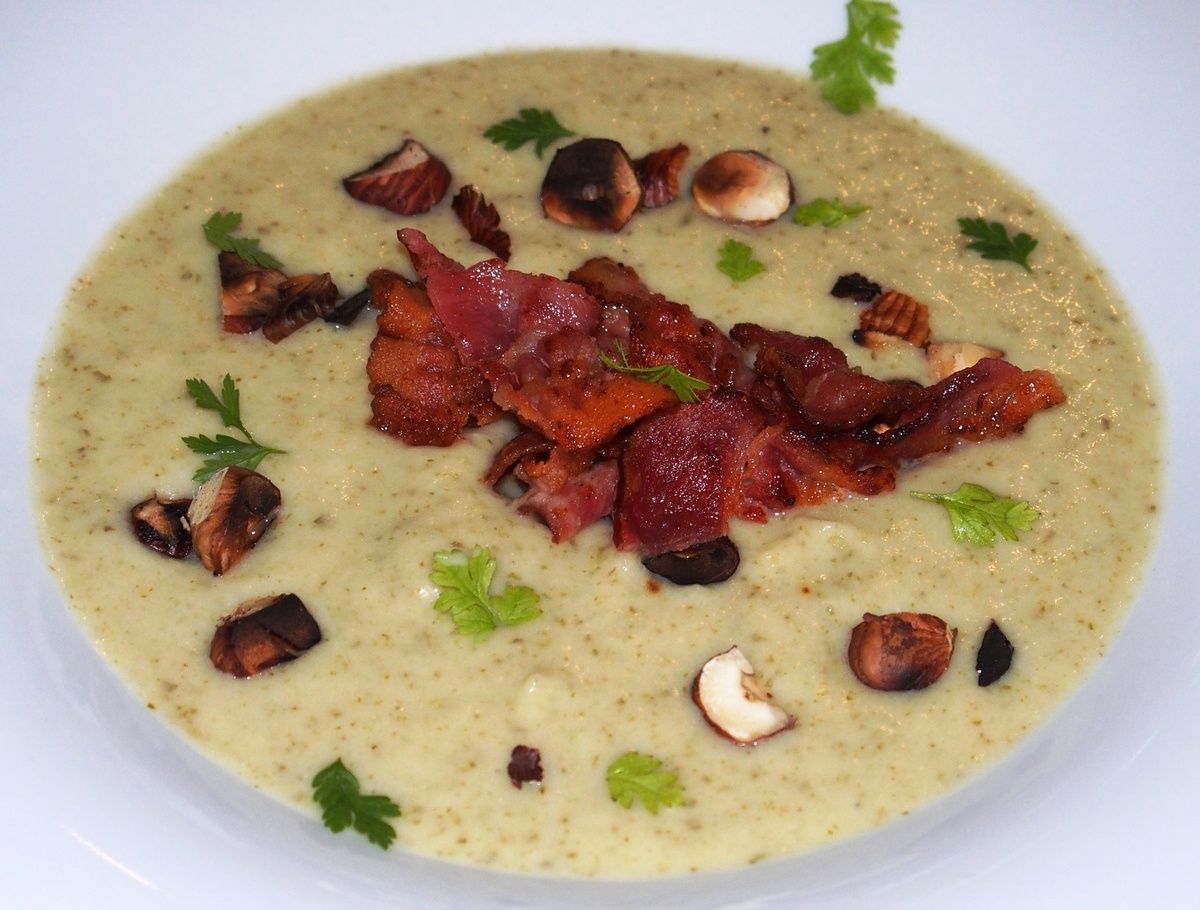 Un velouté au goût citronné, subtil. Agrémenté de lard grillé et de noisettes concassées pour la déco. Une entrée qui fera tout son petit effet à table. Et qui se déguste tout aussi bien froide, tiède ou chaude!