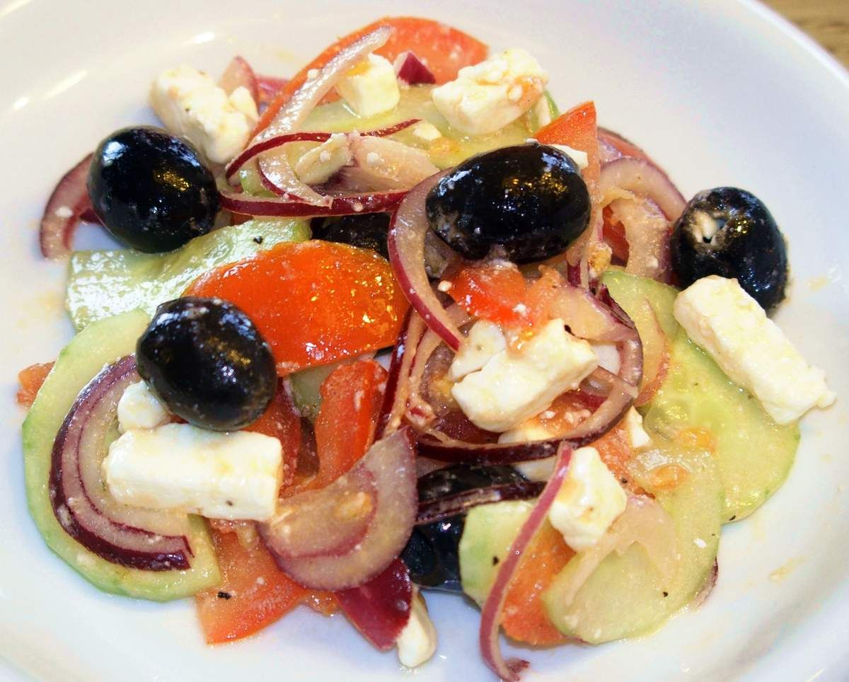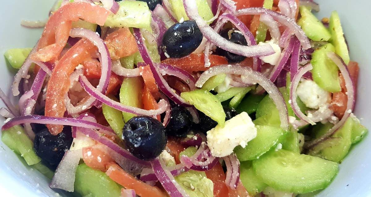 Il y a plusieurs façons de réaliser une salade grecque. Moi j'aime quand les légumes ne sont pas coupés trop gros, comme la feta d'ailleurs. Et l'oignon rouge, c'est important. Légèrement doux, il apporte son petit grain de sel! Allez-y, cette salade est d'une simplicité folle!