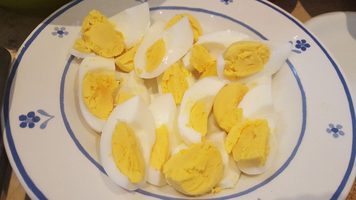 2) Mettre les oeufs dans une casserole d'eau froide avec un filet de vinaigre. Porter à ébullition puis baisser à frémissements. Après 10 minutes, sortir la casserole du feu et la mettre sous un filet d'eau froide dans l'évier pour stopper la cuisson. Laisser tiédir ou refroidir puis les écaler et les couper en quatre. Réserver sur une assiette..