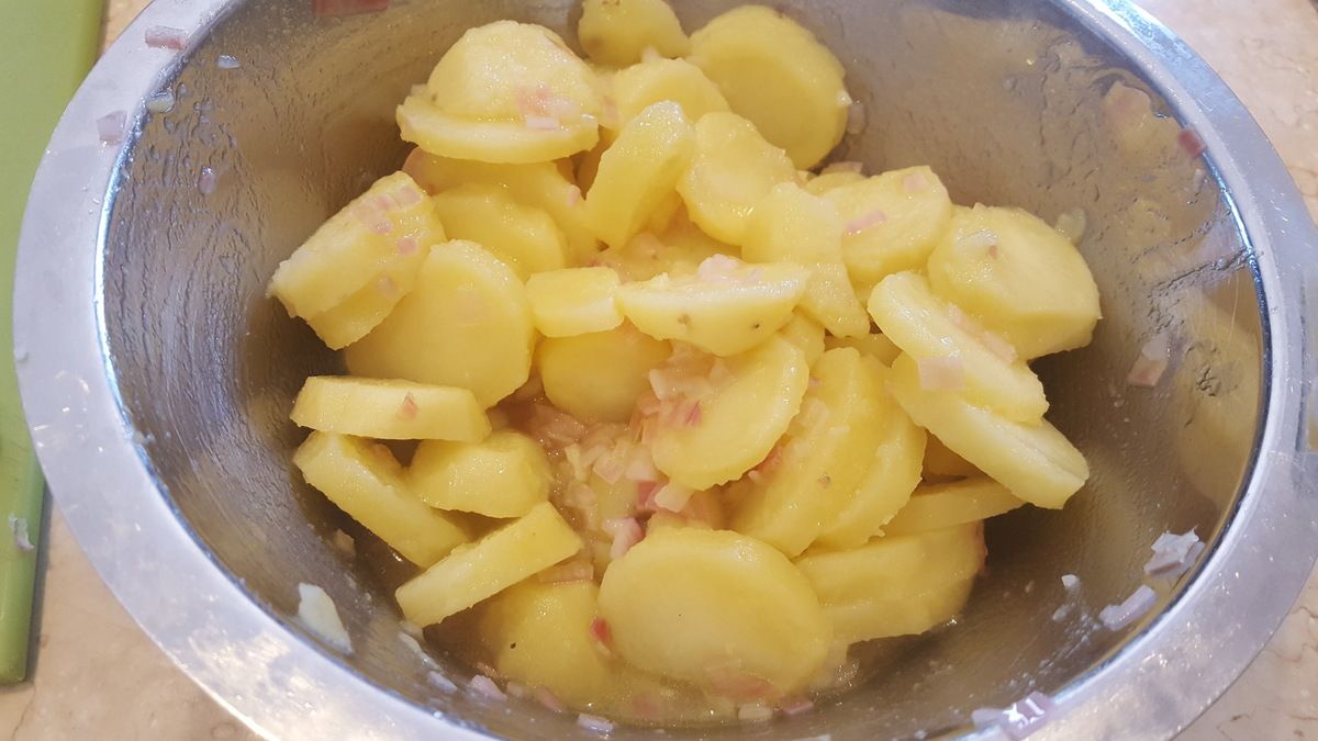 1) Passer les pommes de terre sous l'eau froide. Ne pas les peler. Les mettre dans une casserole d'eau froide. Porter à ébullition puis baisser le feu à frémissements. Laisser cuire entre 20 et 25 minutes. Vérifier la cuisson en plantant la lame d'une petit couteau, la chair ne doit pas montrer de résistance. Laisser tiédir puis peler les pommes de terre et les couper en rondelles et les mettre dans un plat. Peler et hacher l'échalote. Dans une casserole, faire chauffer le vinaigre de vin blanc, le vin blanc, 3 càs d'huile, l'échalote hachée et une pincée de sel. A l'ébullition, stopper le feu et verser ce jus sur les pommes de terre encore tièdes. Laisser imbiber.