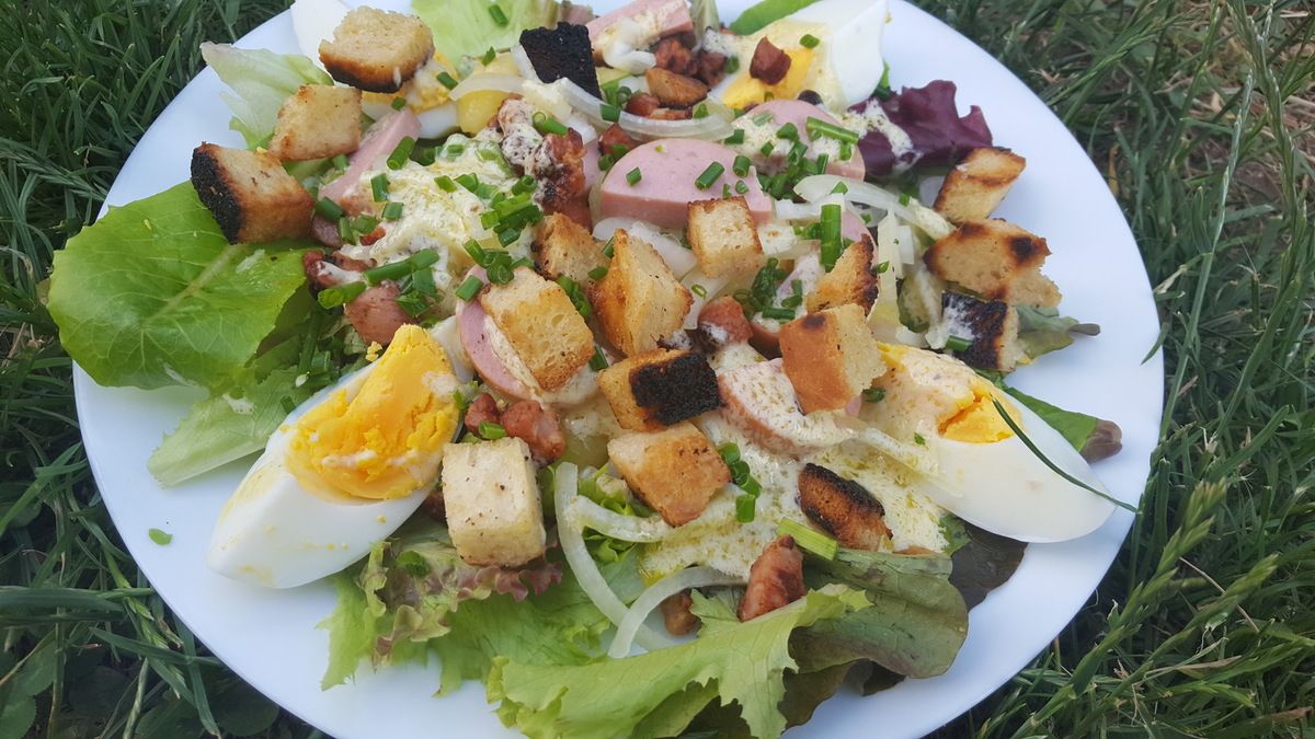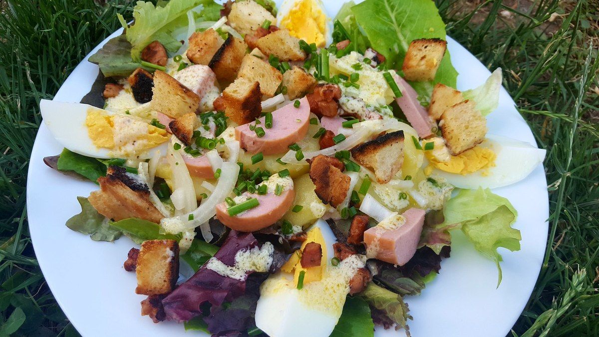 Un peu de préparation, certes, mais à l'avance, donc... Et vous n'y trouverez que des bonnes choses: des cervelas, des oeufs, pommes de terre arrosées d'un délicieux jus aux échalotes, des oignons, des croûtons et des lardons. C'est pour ça que c'est bon!