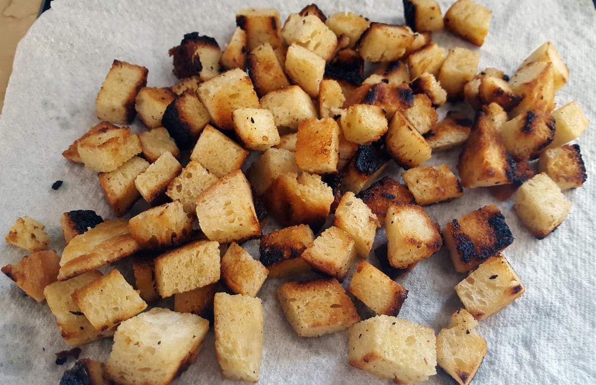 3) Faire dorer les lardons dans une poêle sans matière quelques minutes. Les égoutter sur un papier absorbant et réserver. Couper les tranches de pain en petits dés. Dans une poêle, mettre un morceau de beurre avec un filet d'huile et faire revenir les croûtons quelques minutes en mélangeant. Les égoutter sur un papier absorbant et réserver.