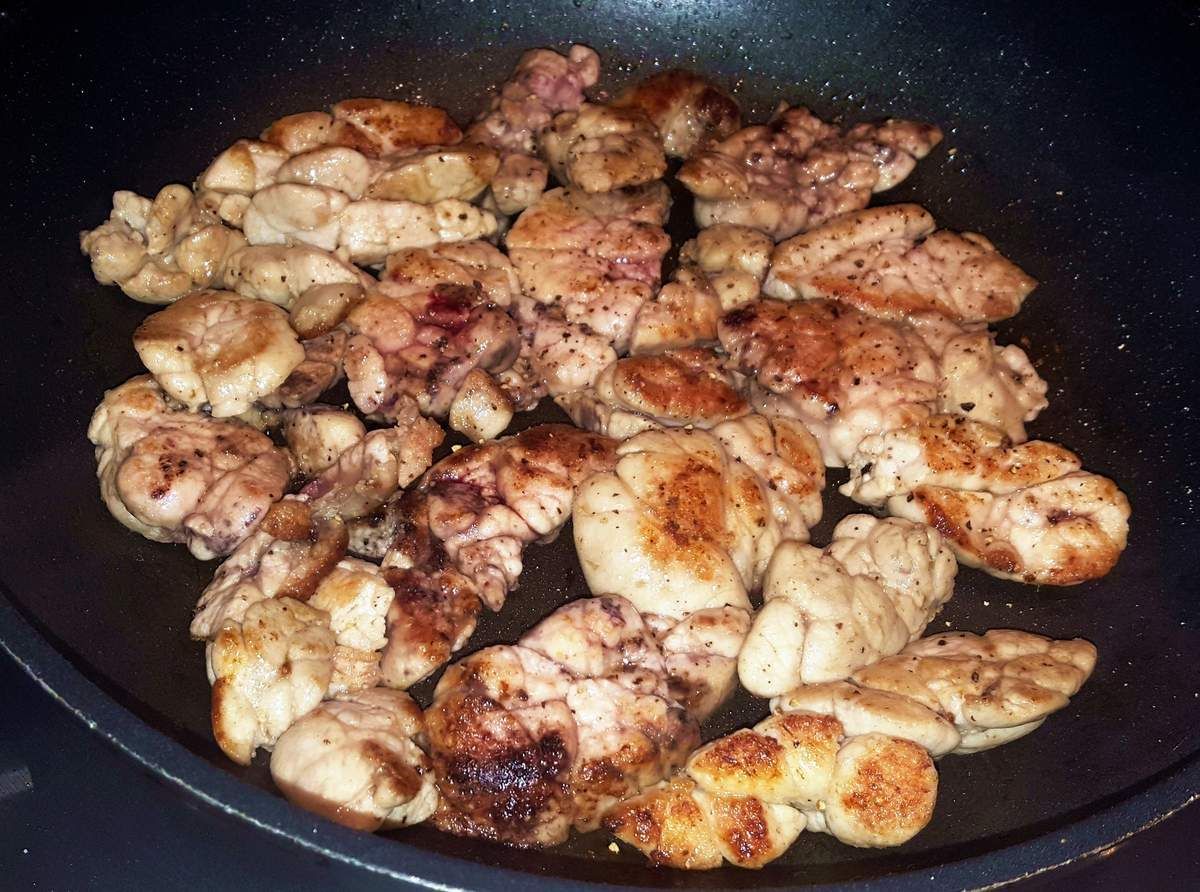 7) Dans une grande poêle, faire chauffer un filet d'huile à rôtir et faire revenir les tranches de ris de veau 3 à 4 minutes sur chaque face sur feu vif. Poivrer et saler.