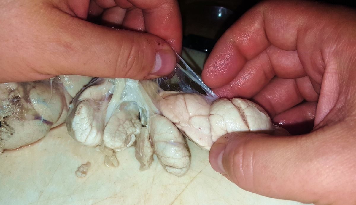 5) Lorsque les ris ont tiédi, les poser sur une planche et enlever la peau délicatement. Enlever aussi toutes les petites parties qui dépassent et qui peuvent paraître gluantes. Couper les ris en tranches d'environ 1cm de largeur.