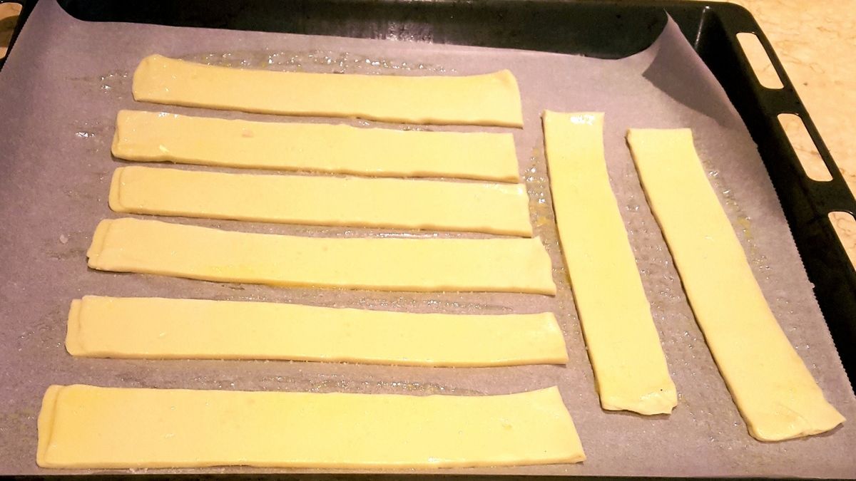 9) Parallèlement à la recette, préparer les feuilletés: préchauffer le four à 200°C. Plier l'abaisse de pâte feuilletée en deux dans la largeur et bien appuyer. Découper des rectangles de pâtes. Badigeonner au pinceau avec un oeuf légèrement battu. Saupoudrer de fleur de sel. Enfourner sur une plaque recouverte de papier sulfurisé à mi-hauteur pendant 15 à 20 minutes. Sortir.