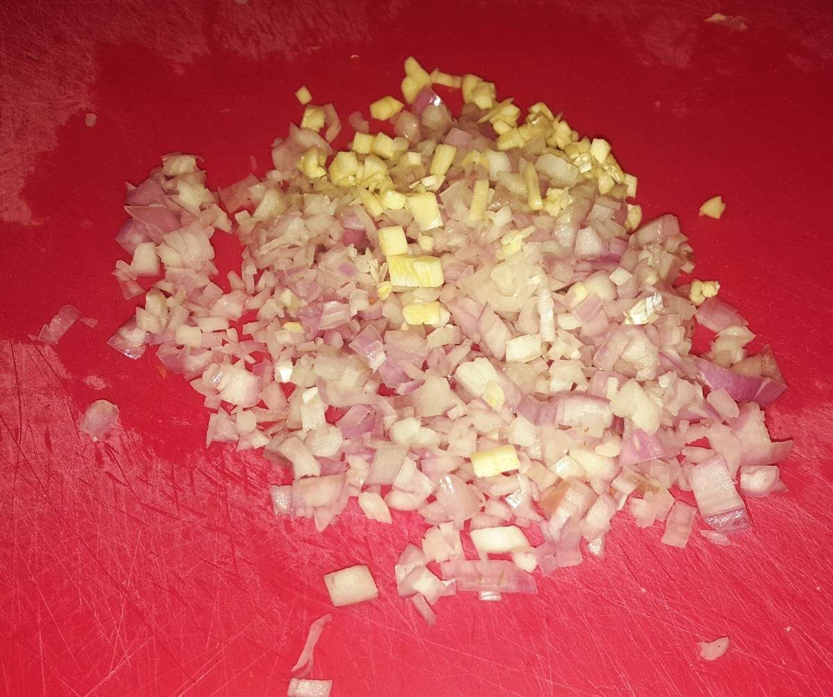 4) Pendant ce temps, filtrer l'eau de trempage des morilles à travers un filtre à café dans un récipient pour en obtenir 3dl et réserver. Couper les morilles en deux dans la longueur et les laver soigneusement sous un filet d'eau froide. Réserver. Hacher les échalotes et l'ail.