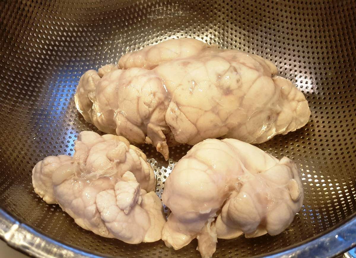3) Rincer les ris de veau soigneusement sous l'eau froide et les mettre dans une casserole remplie d'eau. Porter à ébullition et laisser cuire les ris 5 minutes depuis l'ébullition. Egoutter et laisser tiédir.