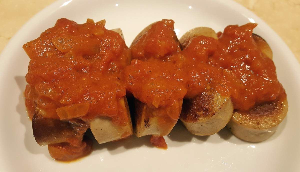 De la saucisse de veau pour ma part (mais prenez une vraie "Bratwurst" si vous voulez vraiment vous la jouer typique), nappée d'un délicieux condiment fait de tomates, curry, vinaigre, moutarde, sucre et ketchup. J'ai beaucoup aimé, oui oui. Et non, cela n'est pas doucereux. C'est top. Et cela va vous donner une nouvelle idée pour cuisiner la petite saucisse qui pleure d'ennui dans votre réfrigérateur. Soyez sympas, ne la laissez pas dans cet état.